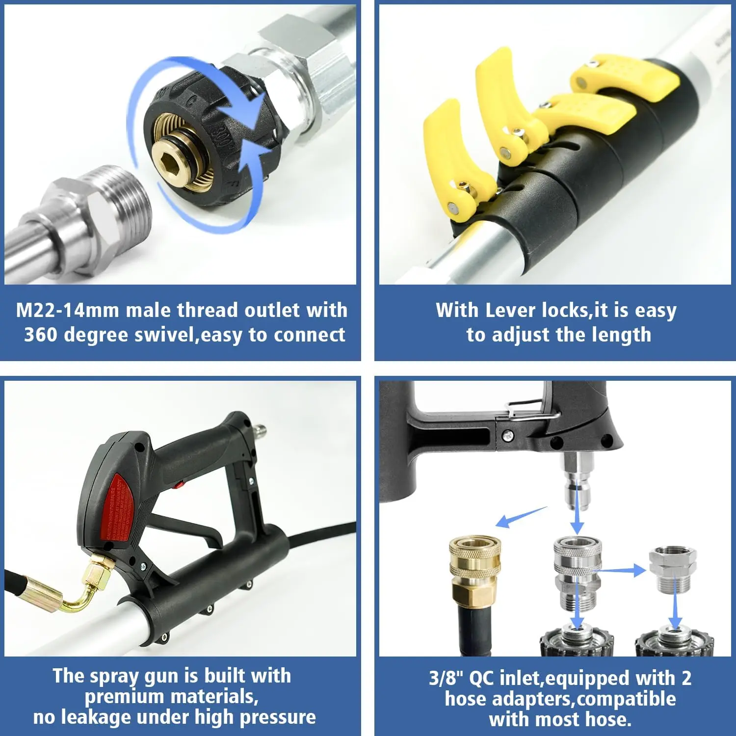 MORE CONVENIENCE - There are 4 adjustable sections with lever locks,set up the length you need, then lock it down for even results.M22-14mm male thread outlet keeps extension wands stable.Equipped with 2 hose adapters,3/8'' QC inlet fits most pressure washer hose.