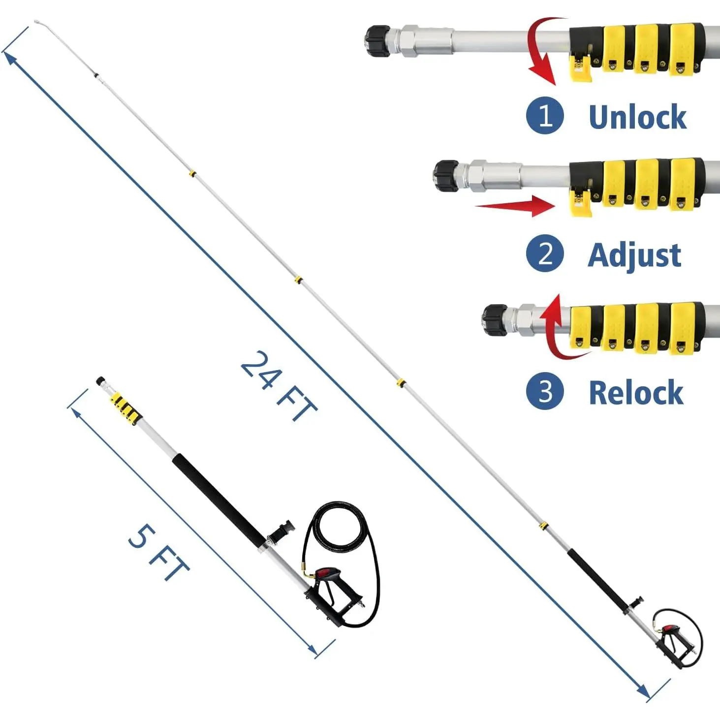 PREMIUM QUALITY - Sturdy and light-weight aluminum telescoping lance is easy to hold and operate.Comfortable padded grip lets you work longer with less fatigue.Fully sealed spray gun and durable pressure washer hose, no leakage.It works with pressure washers rated up to 4,000 PSI.