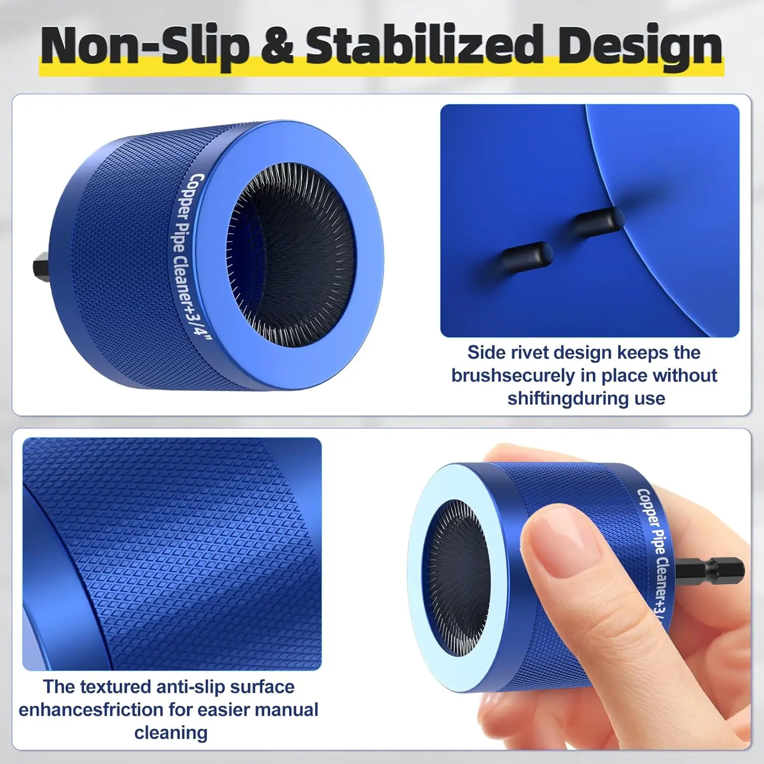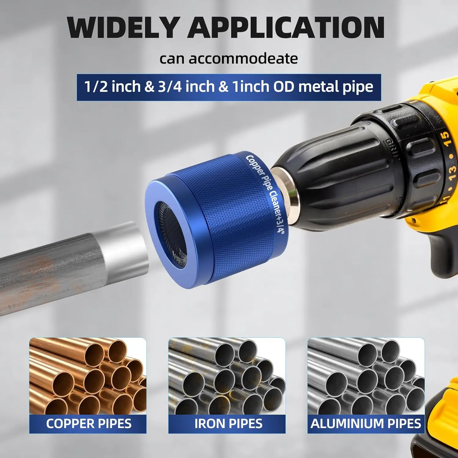 [Complete Kit - Ready to Use Out of the Box]Includes: 1/2", 3/4", & 1" copper pipe cleaners + 3piece 1/4" hex shank (directly fits drills) + 6 stainless steel brush blades (3 pre-installed + 3 backups) + 3 stainless steel wire bore brush for cleaning copper tube ID (1/2", 3/4", & 1")