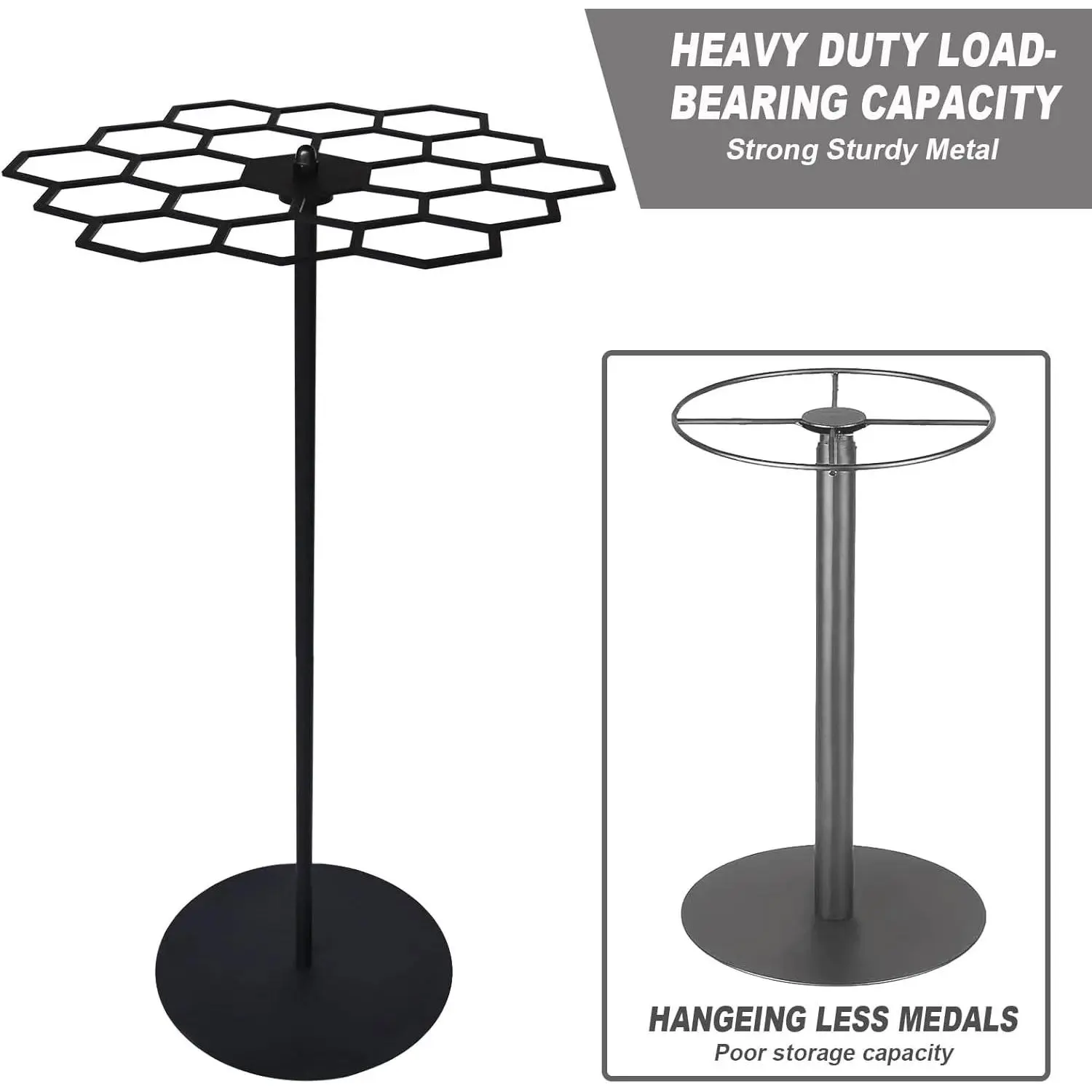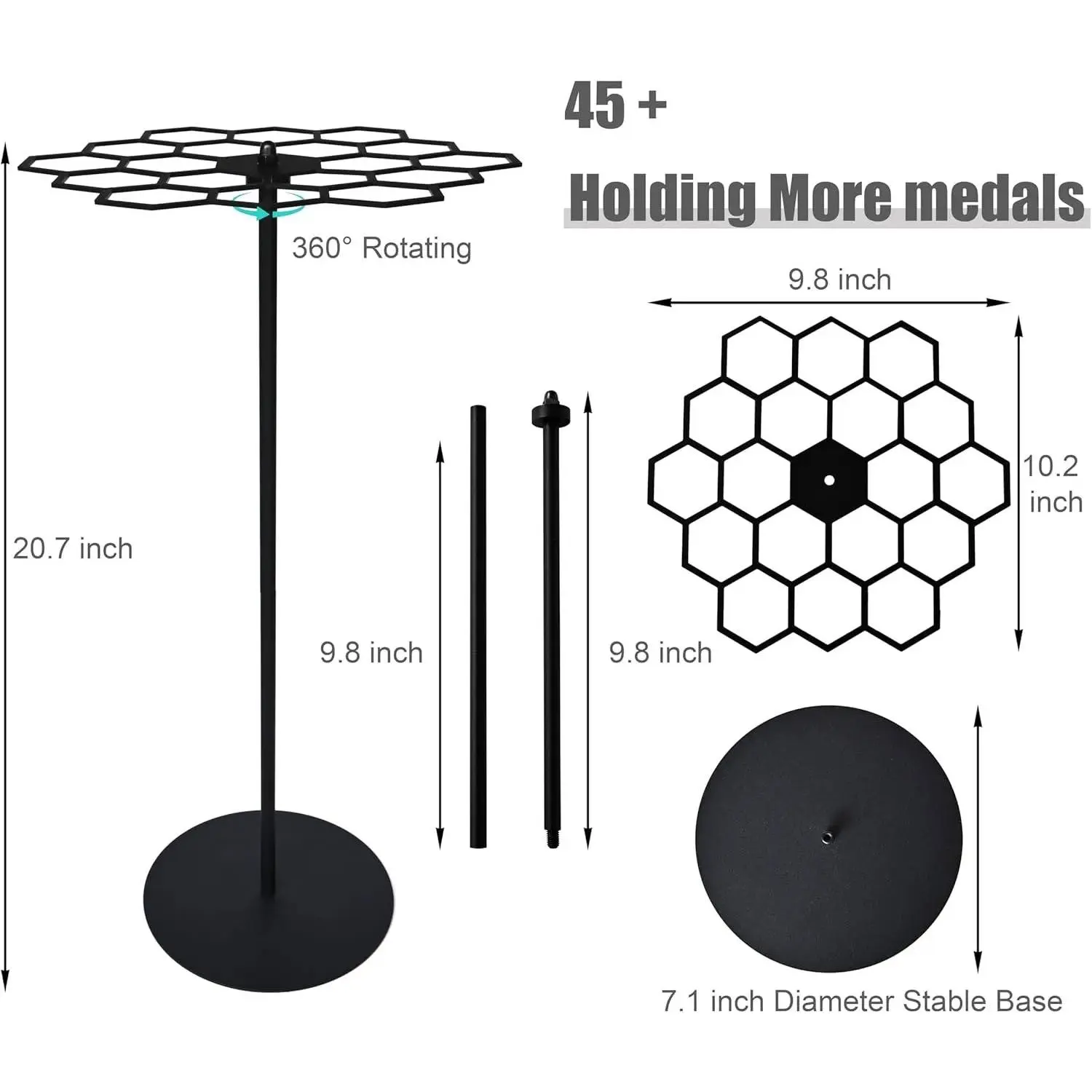 Rotating Medal Display Rack- Features a 360-degree rotating design, with a round stable base in 7.08" Diameter and a hexagonal platter(10.23x9.8"), ample storage hold over 45 medals.This allows for easy viewing and access to your collection from all angles, creating a stunning display of your achievements.