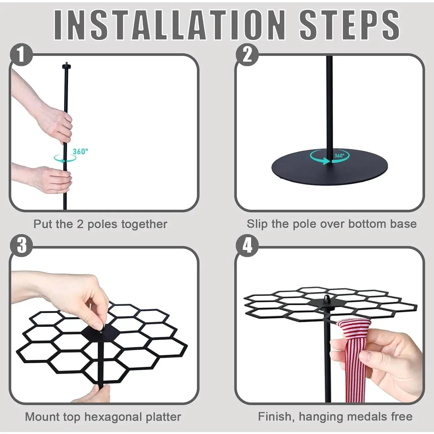 Installing Medal Hanger is a Breeze - simply connect the sturdy metal poles to the stable bottom base and top hexagonal platter.No need to punch holes in the wall, as you can place it directly on desktop.