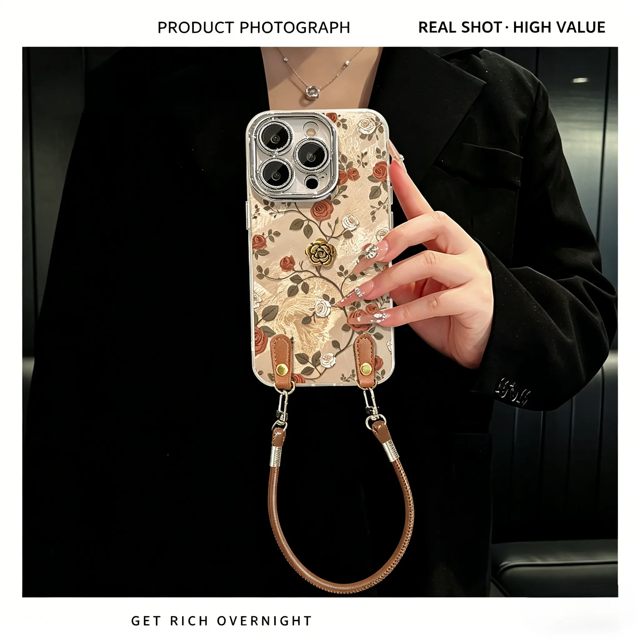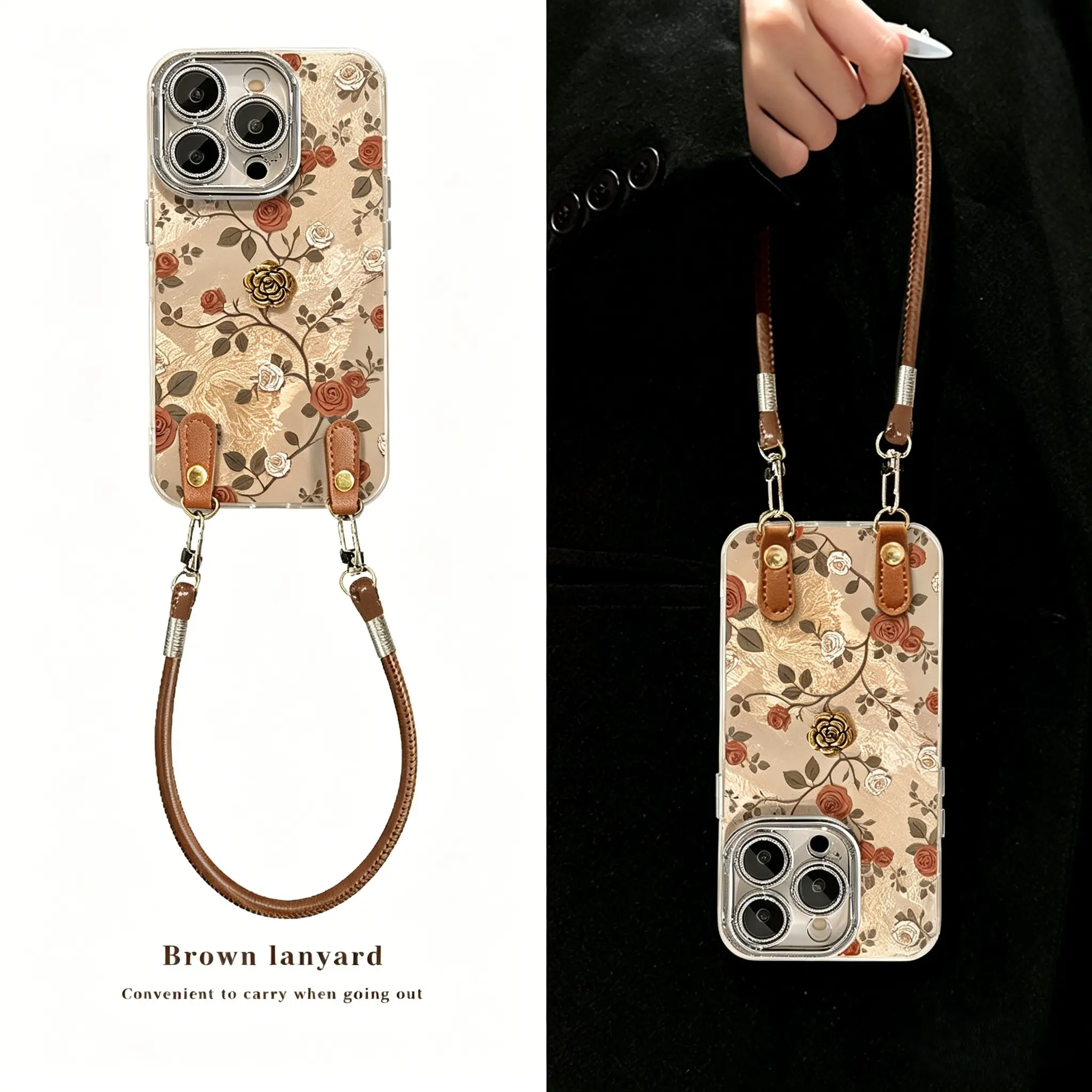 Vintage Rose Phone Case for iPhone 17 Pro Max, Luxury Acrylic Cover with Leather Wrist Strap, Full Camera Protection Shockproof Case, Elegant Floral Aesthetic for Women Girls