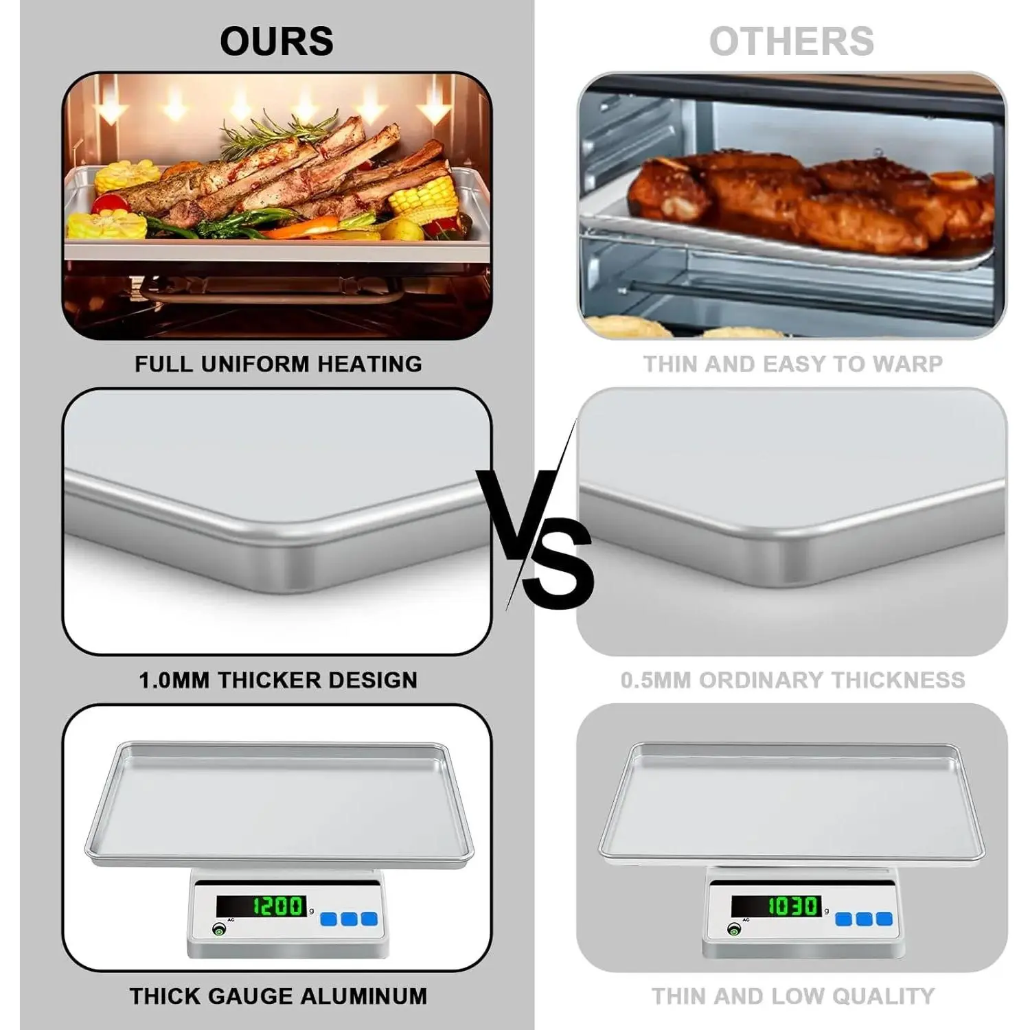 Premium Thick Baking Sheet: Unlike other pans for baking that are too thin and warp, or have a coating that peels and rusts, Our baking tray is made of thick and heavy aluminum, with a heavy rolled edge to withstand temperatures of up to 500ºF / 260ºC without twisting or warping.Pans are made of a special hardened aluminum alloy that provides maximized scratch resistance, making them long-lasting.