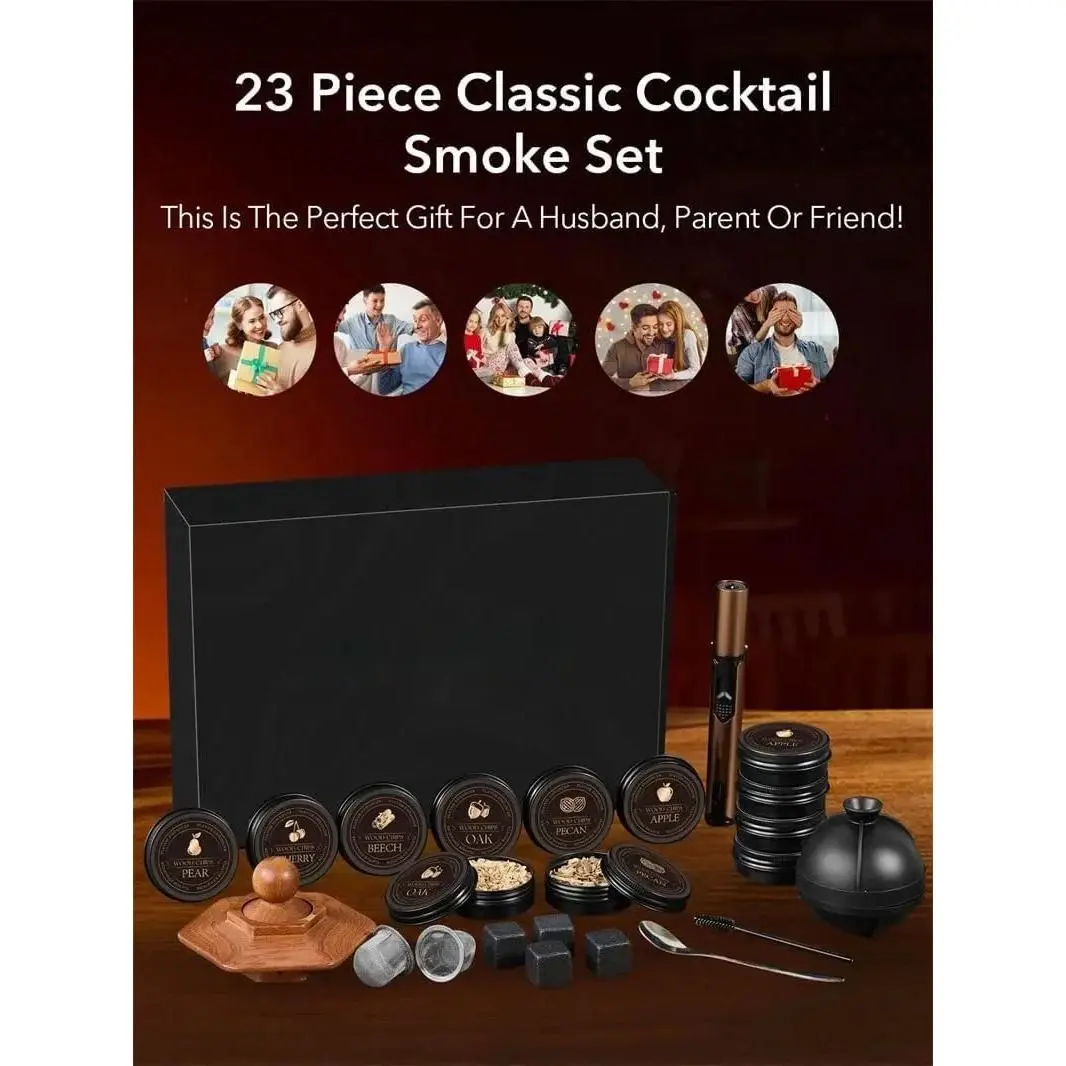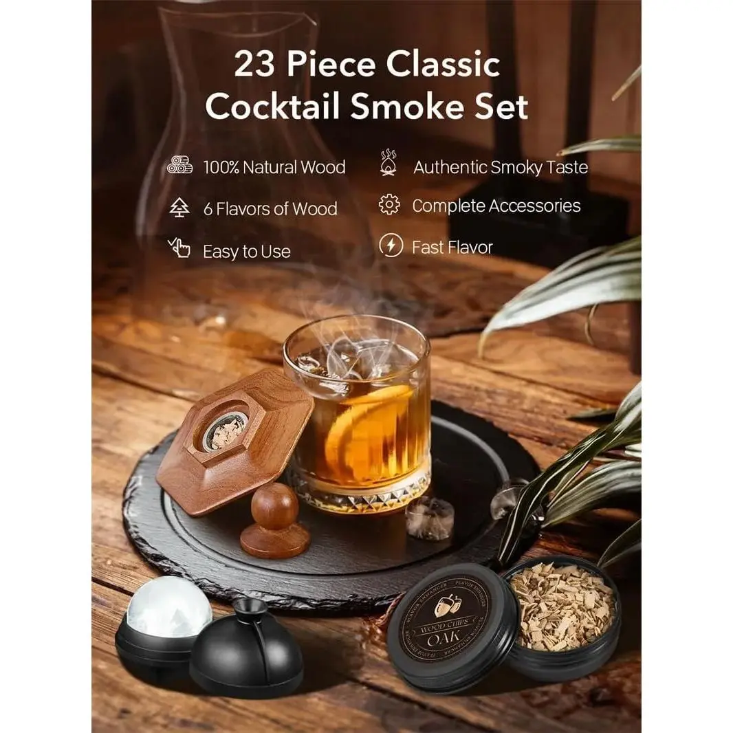[23Pcs Whiskey Gift Set]The cocktail smoker kit is made of high-quality oak wood, which is durable.From a high-end oak wood smoke top, a torch lighter, 12 different natural wood chip flavors, ice molds, metal filter, two Ice Ball Molds, to a beautifully presented gift box, we give you the complete package to enhance your at-home bar and kitchen