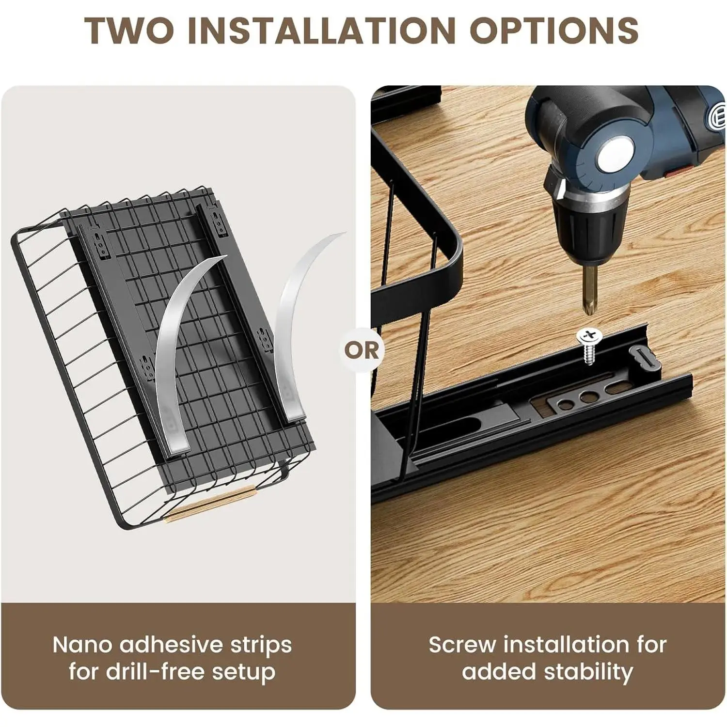 Premium Material: These pull-out drawers for cabinets is made from high-quality carbon steel, designed to support heavy items such as pots, pans, and appliances without bending or warping.The rust-resistant finish ensures long-lasting durability, making it the perfect solution for maximizing limited storage space in your home.