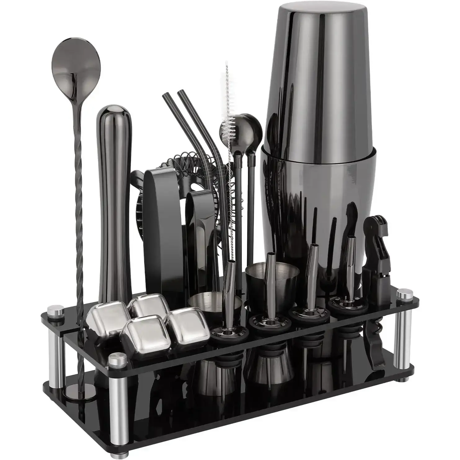 [23 Pcs Cocktail Shaker Set]Boston bartender kit, One set to meet all your needs Bar Tools kit.Consists of a set of 20oz & 24 oz Boston Shaker Tins, 4 Pourers, Double Measuring Cup 15/30ml & 25/50ml, an Ice Tongs, a Muddler, 2 Straws Spoon, 2 Bent Straws, a Brushes, a Mixing Spoon, 4 Stainless Steel Stones, a Cocktail Recipe, a Stones Clip, a Strainer, an Acrylic Stand, And there is an exclusive recipe guide, which makes it easier to use for beginners.