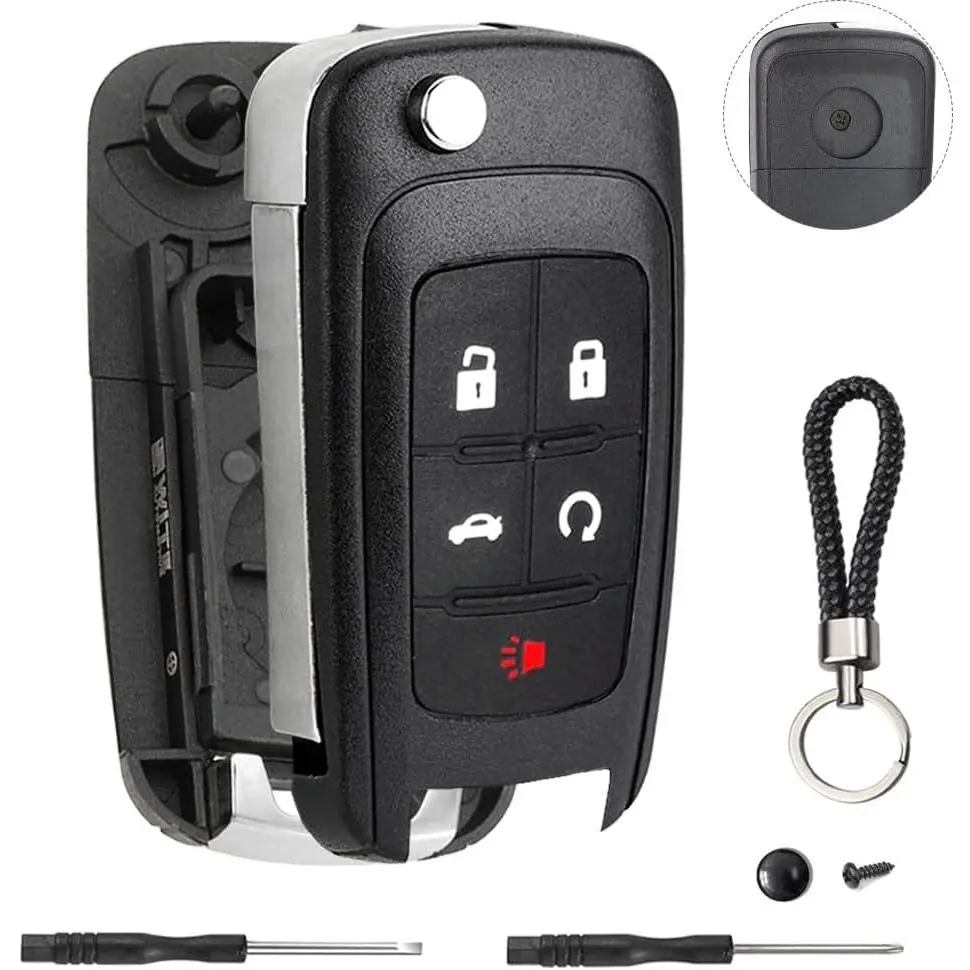[Package Includes]You will get 1pc 5 button flip key fob replacement case shell fits for Chevy, come with uncut blank key blade, 1pc keychain, 1pc black round stickers dots and 2pcs mini screwdrivers.Please Note: Includes plastic car key fob case shell and uncut keyblade only, No electronics interior (No remote control/No battery/No transponder chip).