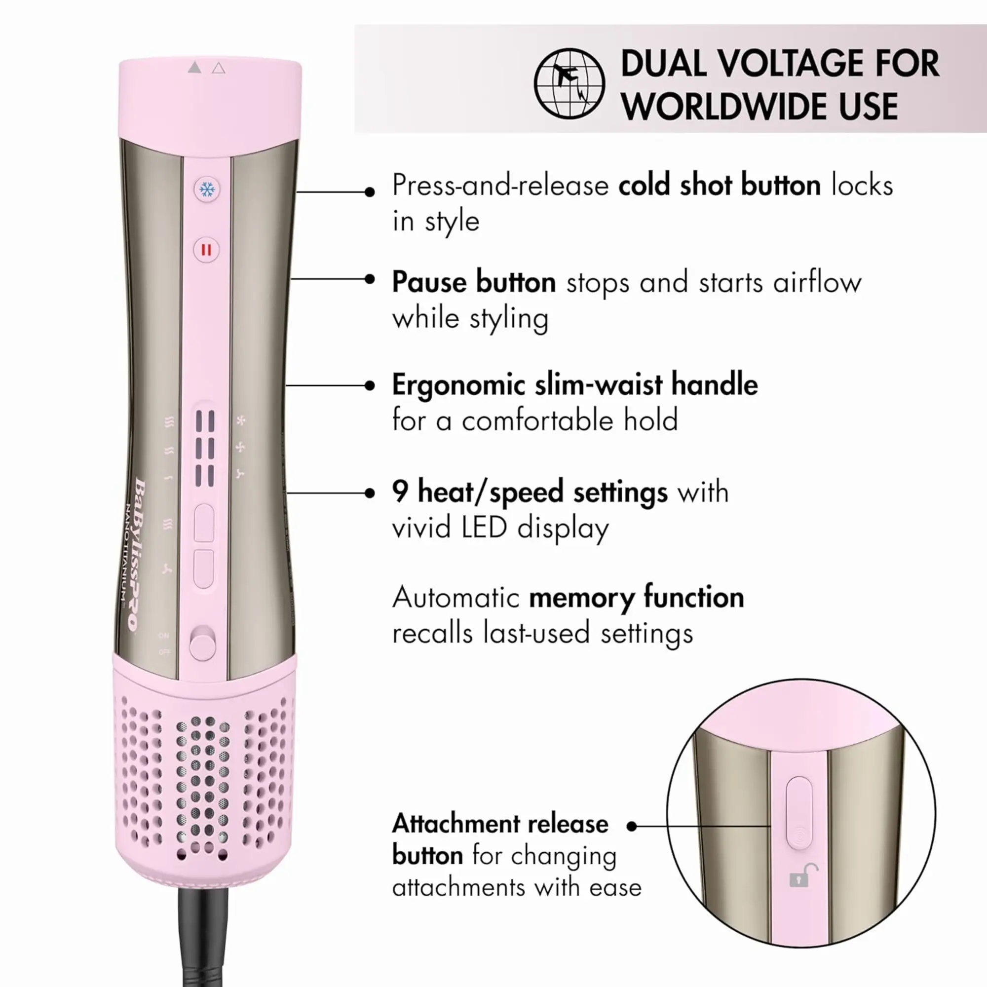 Achieve salon-quality results at home with the BaBylissPRO Nano Titanium Pink Style/Switch Ionic Multi-Styler & Dryer. Designed for versatility, it combines powerful drying with multiple styling options to create smooth, voluminous, or sleek looks. Nano titanium technology ensures even heat distribution, while ionic technology reduces frizz and enhances shine. Lightweight and ergonomic, it offers easy handling for everyday styling with professional performance and long-lasting results.