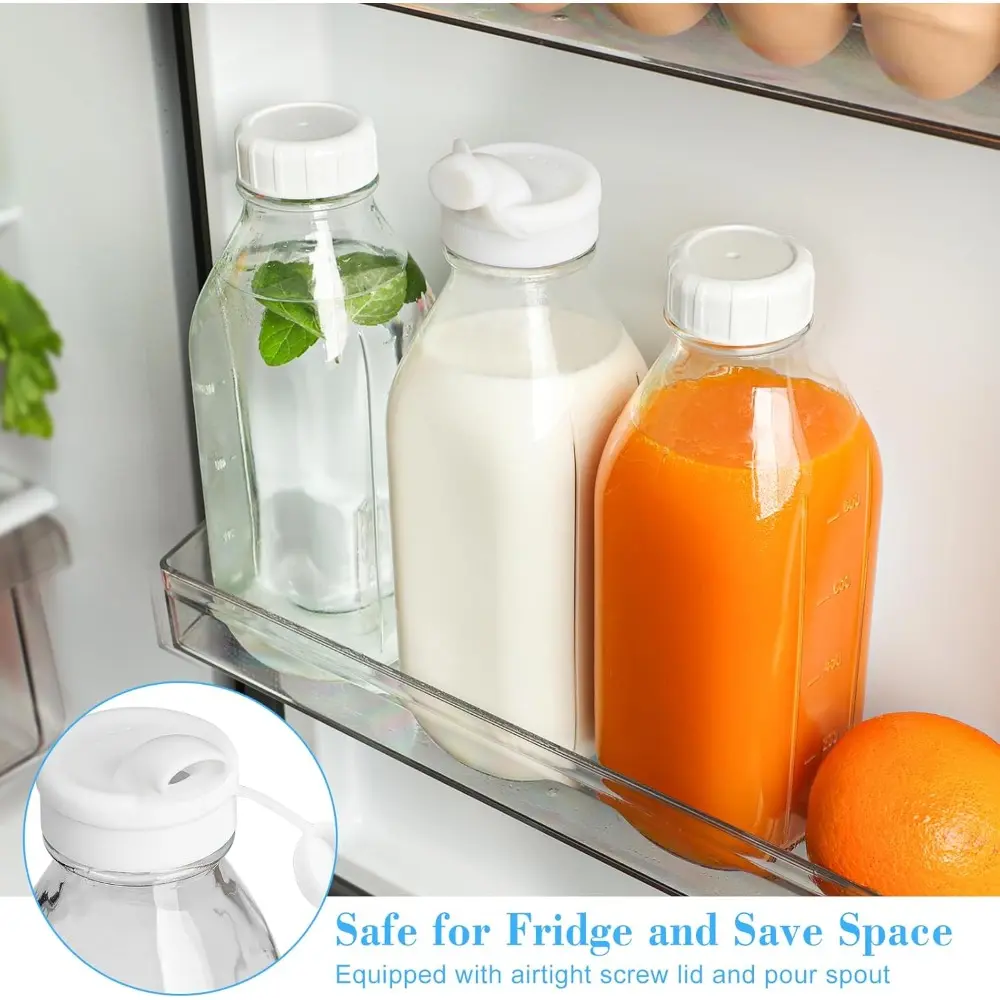 Good Sealing and No Leaks: Glass juice bottles come with customized threaded lids and removable silicone sealing gaskets, lids are made of top quality materials, sturdy and durable, easy to open and close, and strong airtight screw caps are reusable