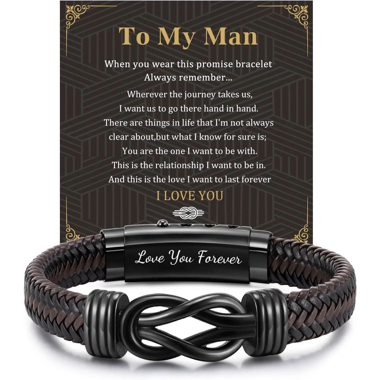 Leather Bracelets for Men: This braided cuff bracelet engraved "Love You Forever" inside, symbolizes the eternal emotional connection between you and your loved one, whenever you're faced with distance, loss, struggle or disagreement, when he wears this infinity bracelet, he'll be reminded how important he is and how much you love him, gifts for your loved one.