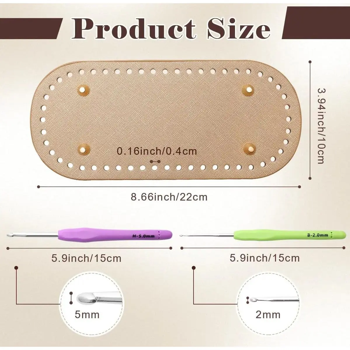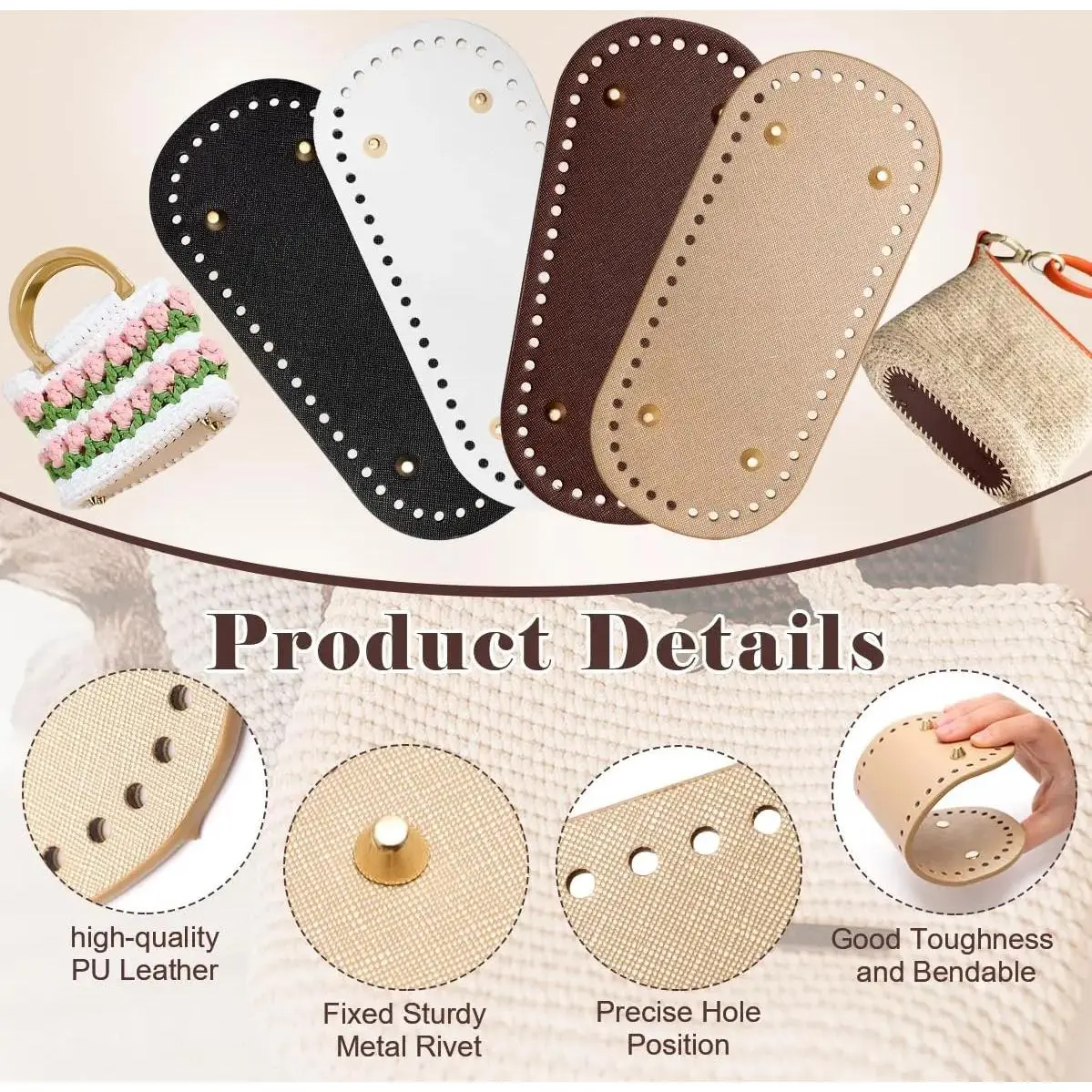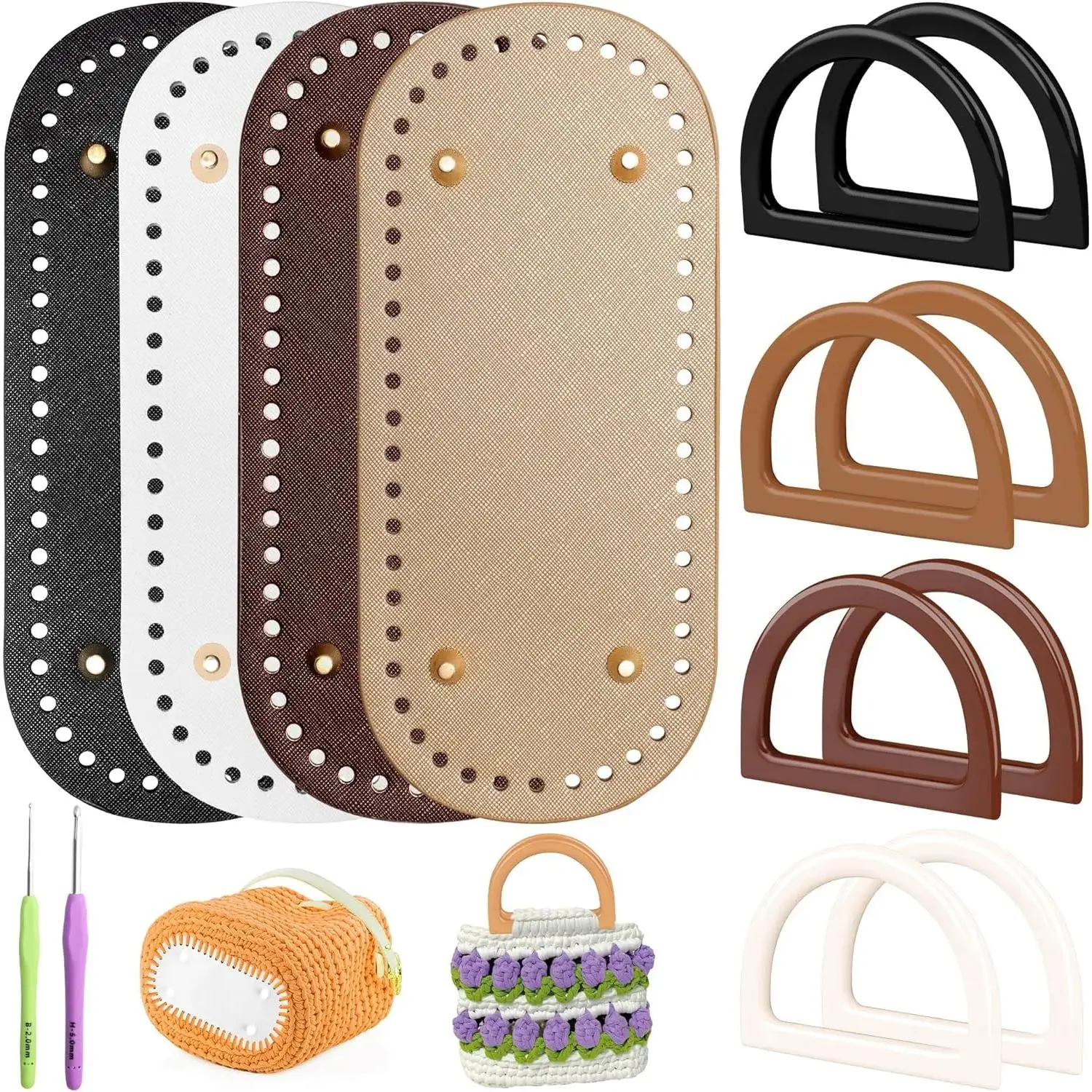 Includes: 4+8 PCS bag bases, 2 PCS crochet hooks, D shape purse handles, leather purse bottoms.📋