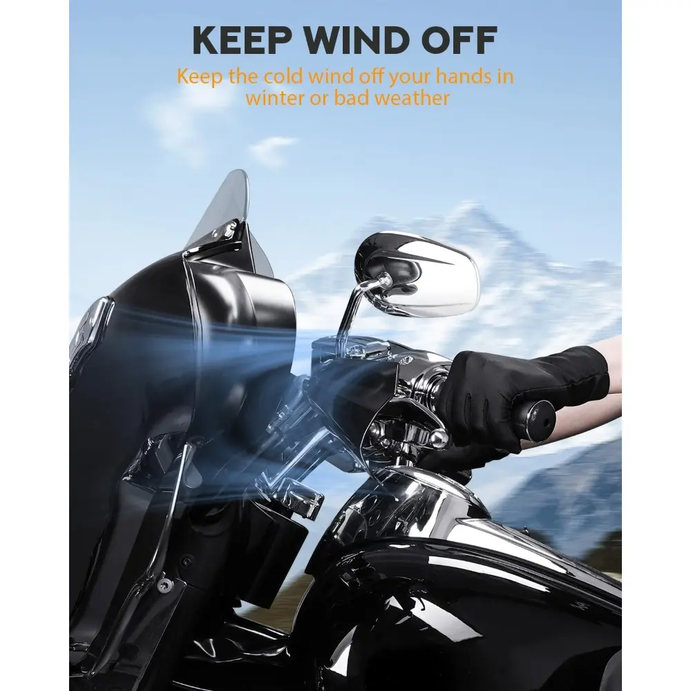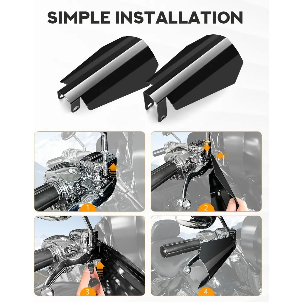 FEATURES - Stylish,functional and durable hand guard,protect your hands from brush,rocks,mud and cold wind.Keep your hands warm and dry while riding.With enough room for brake cables control and other devices.Easy to install,don't need extra mounting hardware,just remove to the control boss of your mirrors.Some FXDLS models you may need to run turn signal relocation brackets fit for Harley turn signal swivel 68185-00.