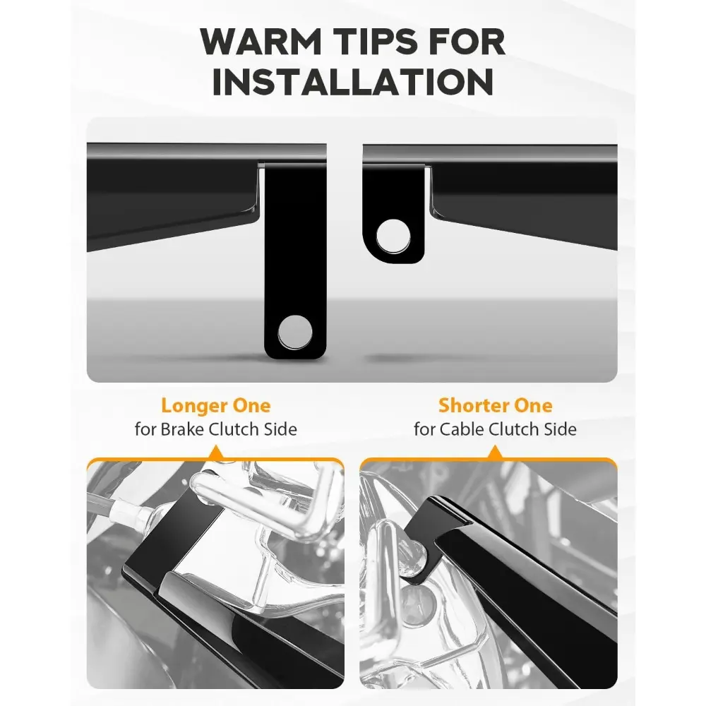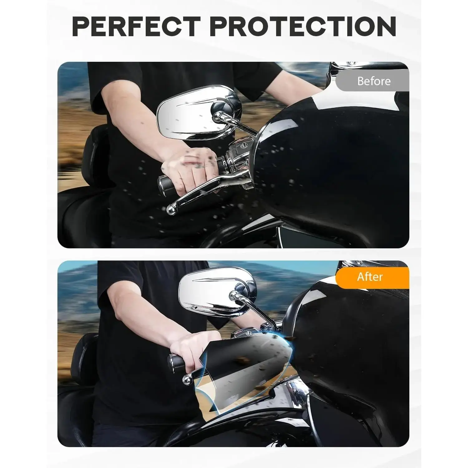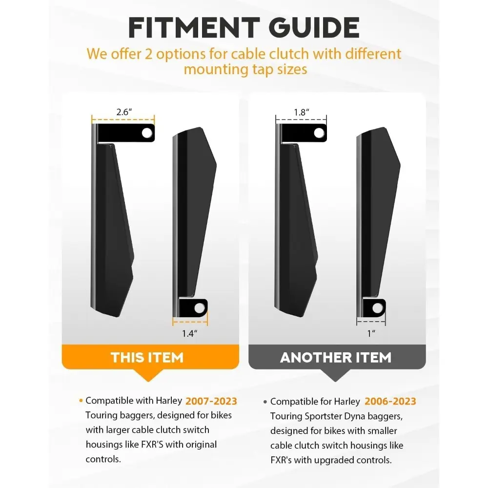 FITMENT - Large hand guards fit for Harley 2007-2023 Touring baggers and bikes with the larger switch housings;older model FXR'S with large switch housings.(One of the hand guards has longer mounting tag,it goes on the brake side,the short one goes on the cable clutch side.If you run a 2014 or Newer baggers with a hydraulic clutch , the mounting tabs don't need to be different sizes.If you mind how it looks like,you might need to modify the long one.)