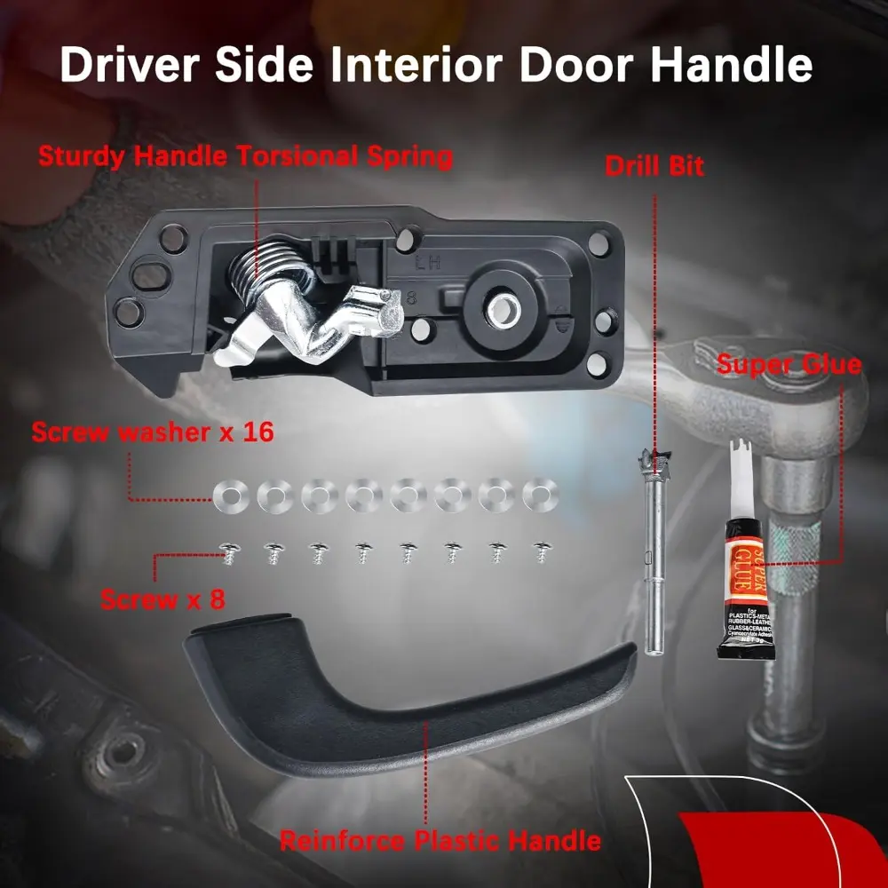 [ONE-YEAR-WARRANTY]1 x inner door handle housing with hinge + 1 x door handle + 8 x mounting screws + 16 x washers + 1 x drill bit [WARRANTY]Buy with confidence, 12-Months warranty and lifetime support. If any problem, please feel free to contact us to apply the service of carefree REPLACEMENT or REFUND.door handles interior door handles interior door handle interior parts driver side door handle cadillac escalade accessories gmc yukon accessories.