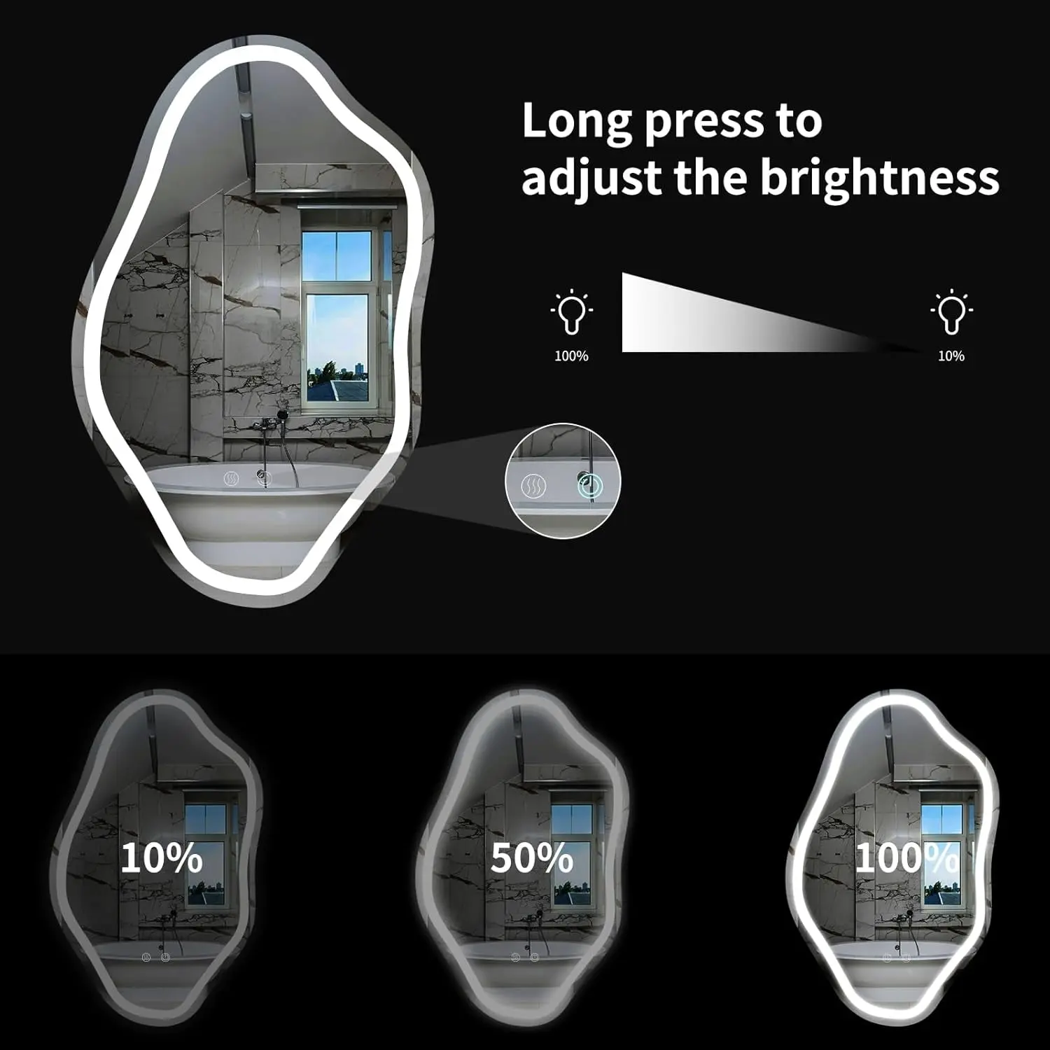 The LumiBased Cloud Irregular LED Bathroom Mirror offers a contemporary design paired with practical features, suited to enhance any bathroom style. It boasts a CRI greater than 90 and provides flicker- and UV-free lighting for a clear and pleasant environment. Separate controls for power and anti-fog functions promote safety and energy savings by ensuring a fog-free reflection even in humid conditions. Crafted from environmentally friendly, copper-free materials with a silvered reflective backing, this mirror delivers durability and an energy-efficient LED lifespan exceeding 50,000 hours. The dimmable lighting can be adjusted with a simple 3-second touch for personalized brightness. With waterproof IP44 rating and thorough durability tests, it includes mounting hardware for easy installation, and customer support is available within 24 hours.