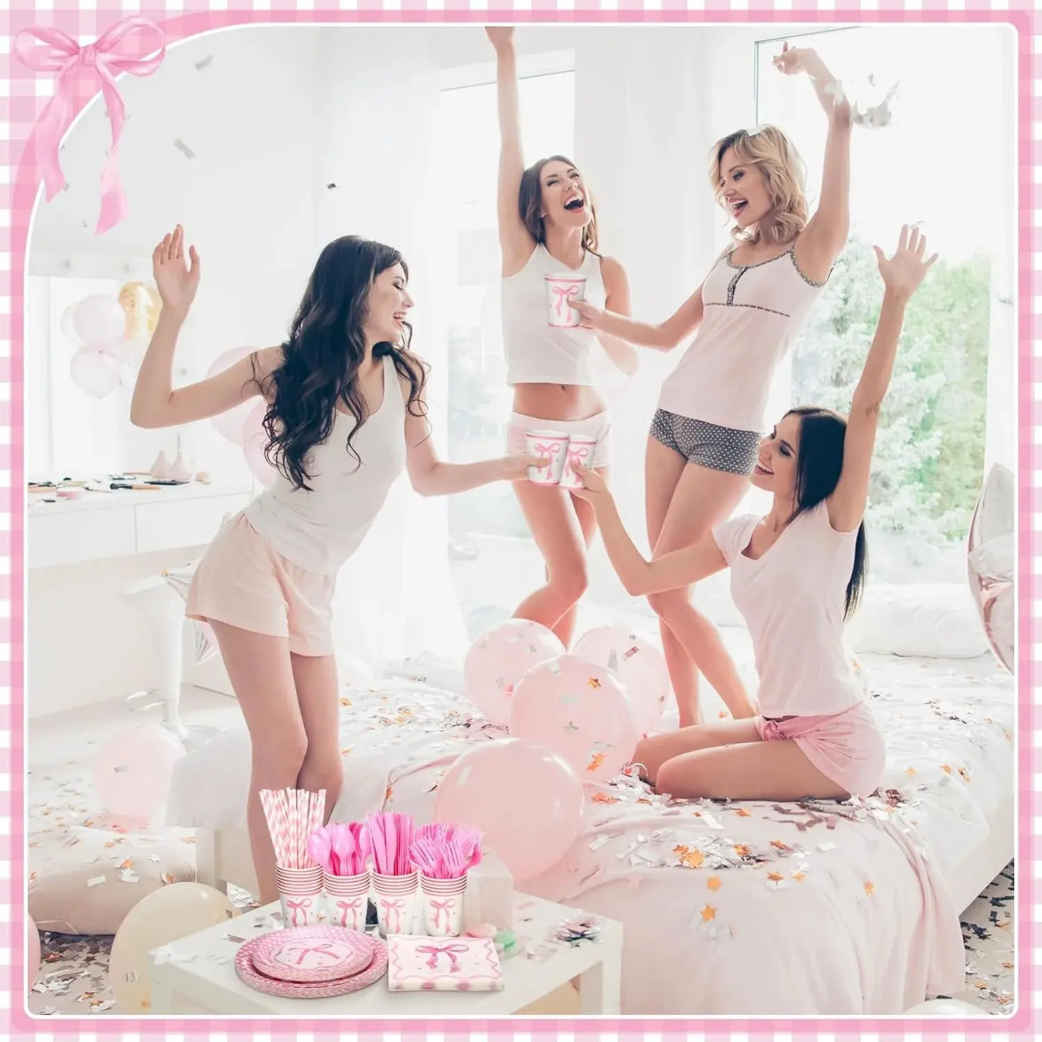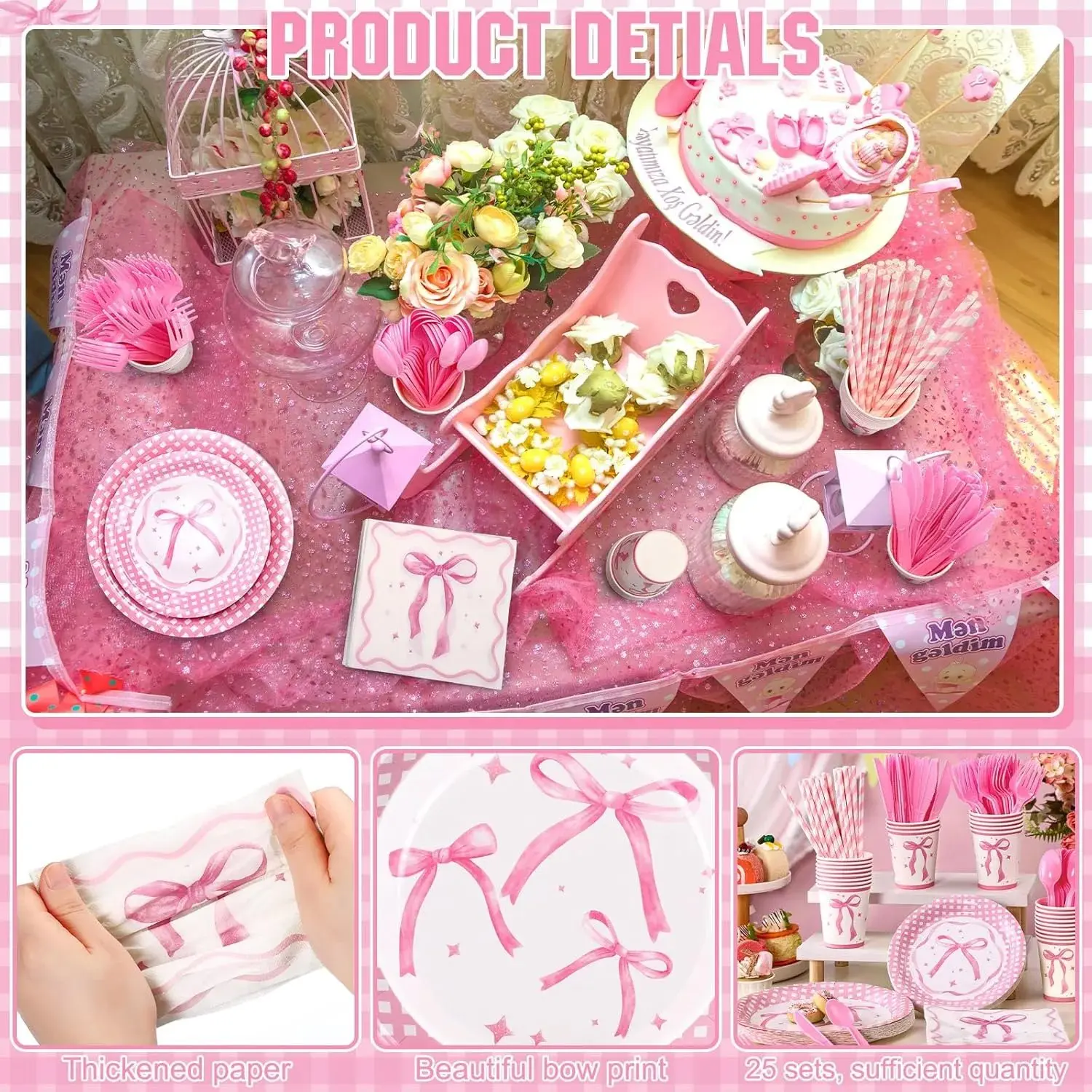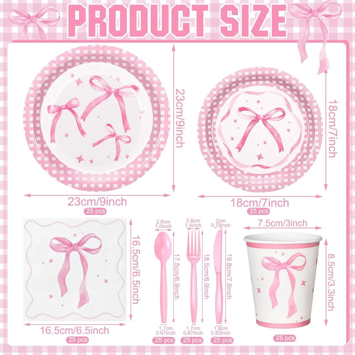 Sever for 25 Guests: this coquette birthday decorations includes 200 pieces of pink bow theme party supplies, including 25 x 9 inch paper plates, 25 x 7 inch paper plates, 25 x Conquette square napkins, 25 x forks, 25 spoons, and 25 x pink and white straws;It can meet the needs of 25 guests, which is suitable for your Conquette party