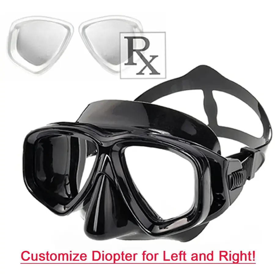 This mask features negative myopia (SPH) lenses available in -0.5 diopter increments (e.g. –1.5, –2.0, –2.5, -3.0..). Each lens is crafted from tempered glass for safe, sharp, and clear underwater vision.