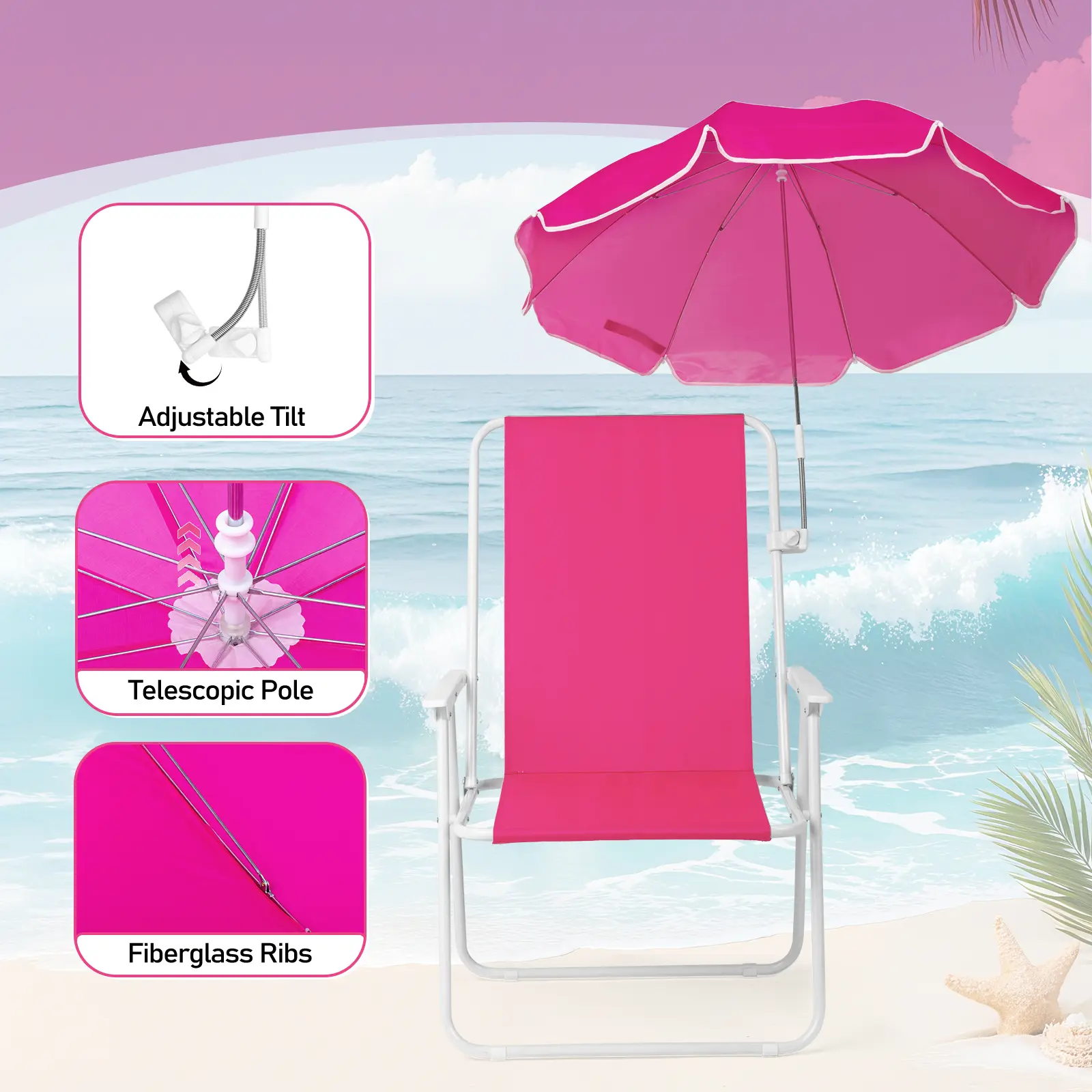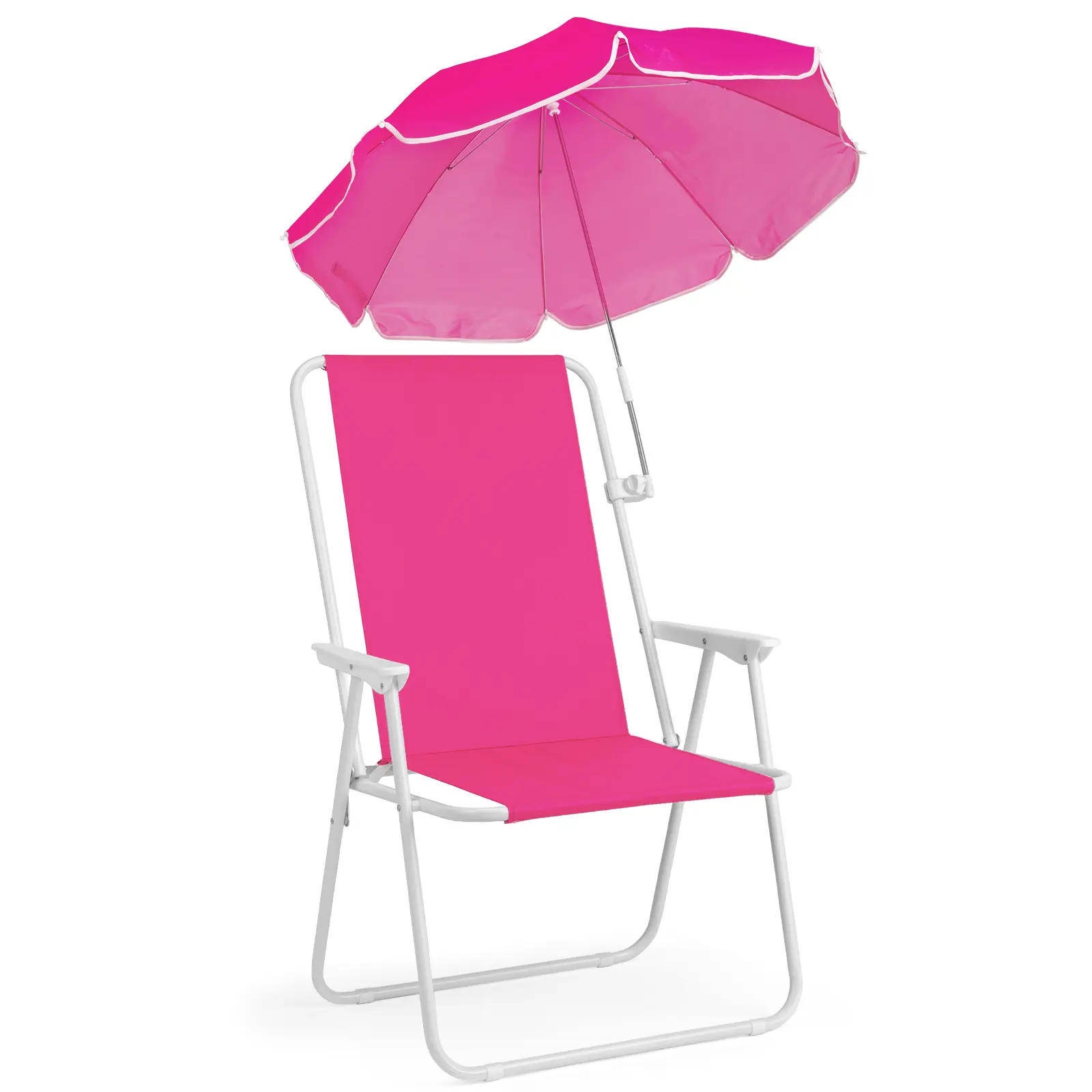 Enjoy all-day comfort and sun protection in style with this XL folding beach chair featuring a vibrant Barbie pink finish and built-in detachable umbrella. Designed for adults who need extra room and elevation, this 15-inch seat height spring chair keeps you comfortably above the sand while the adjustable shade blocks harsh UV rays. Perfect for beach days, camping trips, concerts, or backyard lounging—lightweight enough to carry anywhere, sturdy enough to support up to 265 pounds.