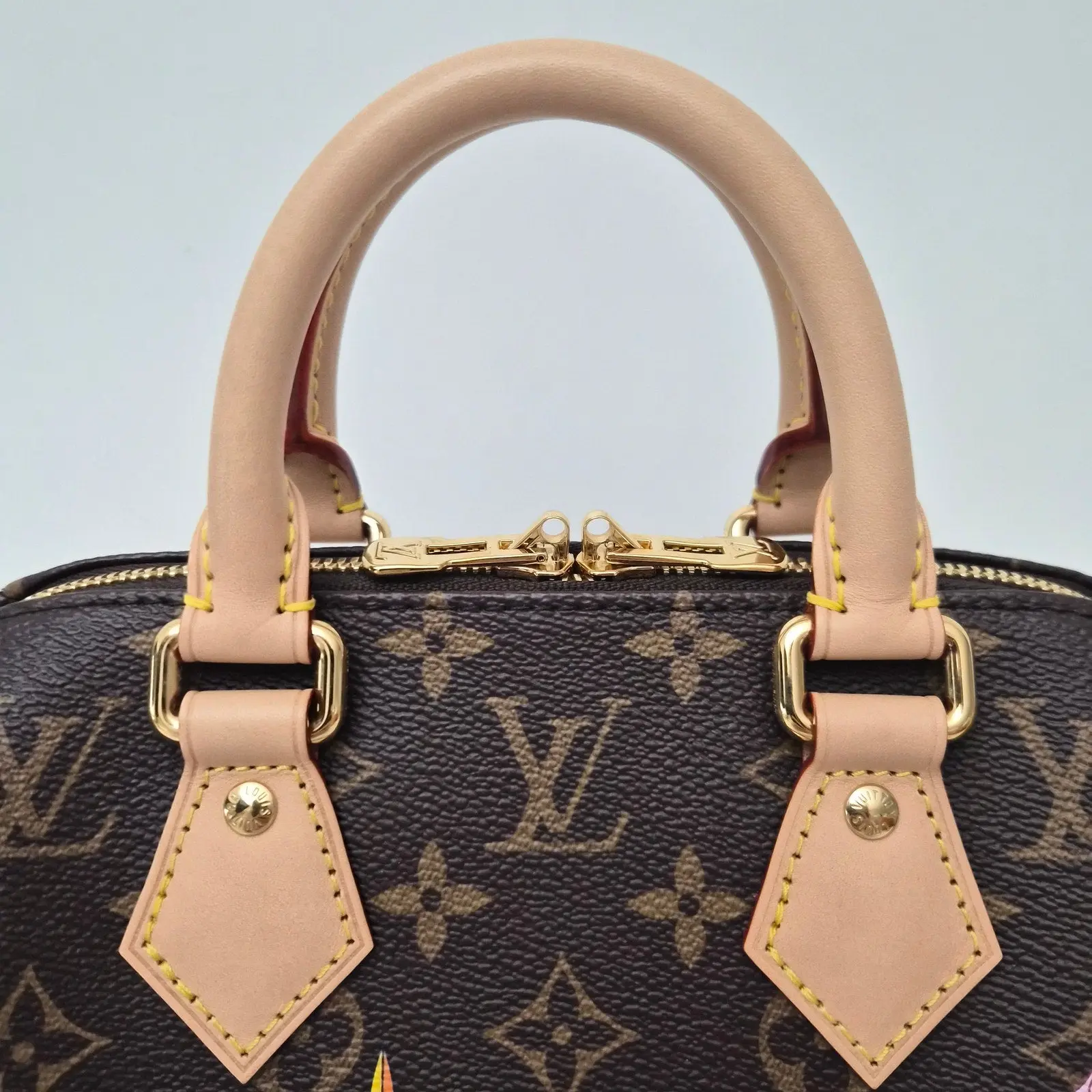 Features: Vachetta cowhide leather rolled top handles and polished brass hardware. The top zipper opens to a red fabric interior with a patch pocket.