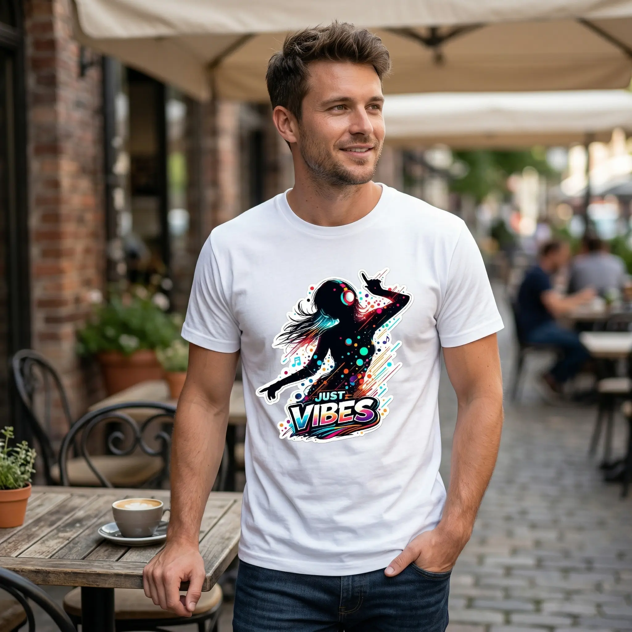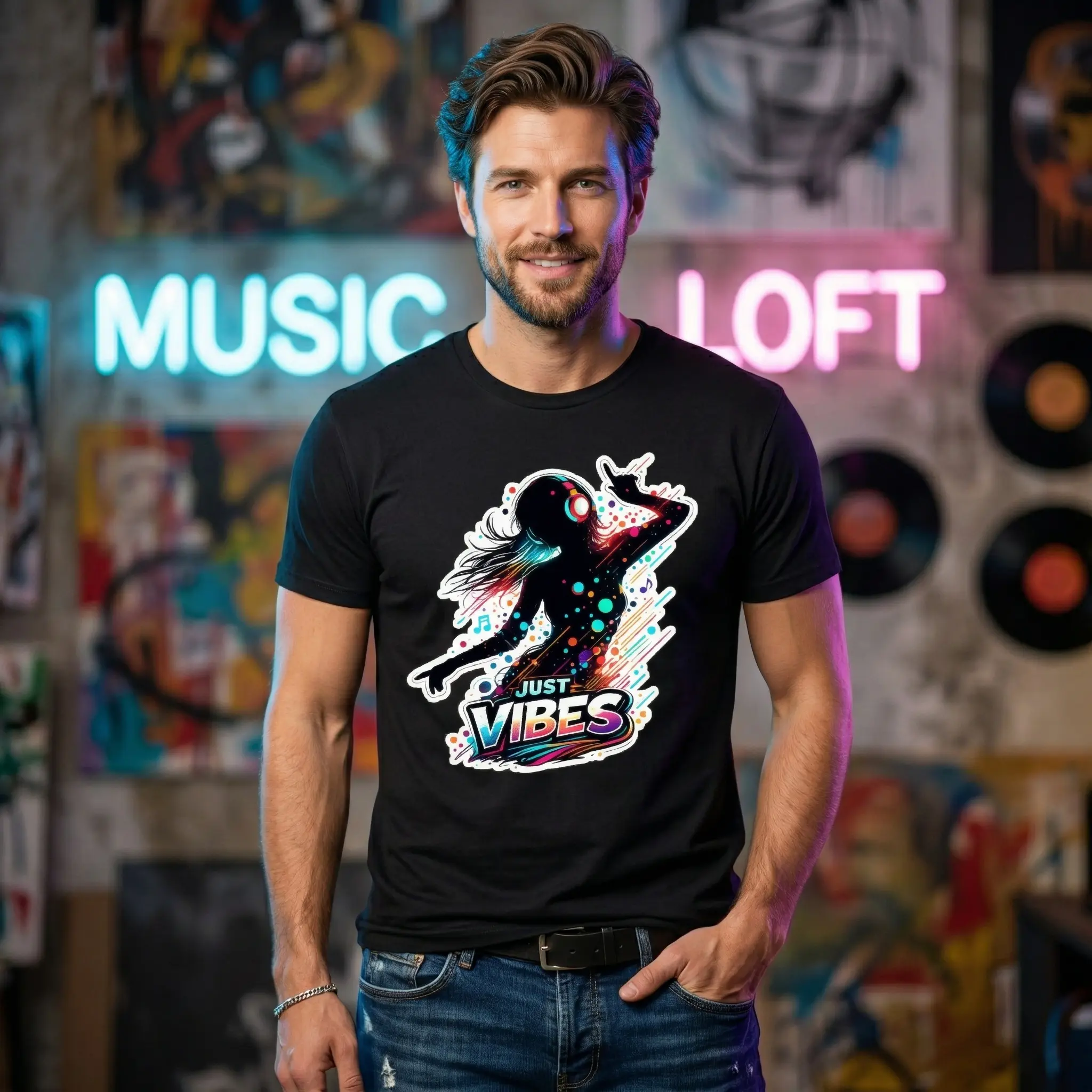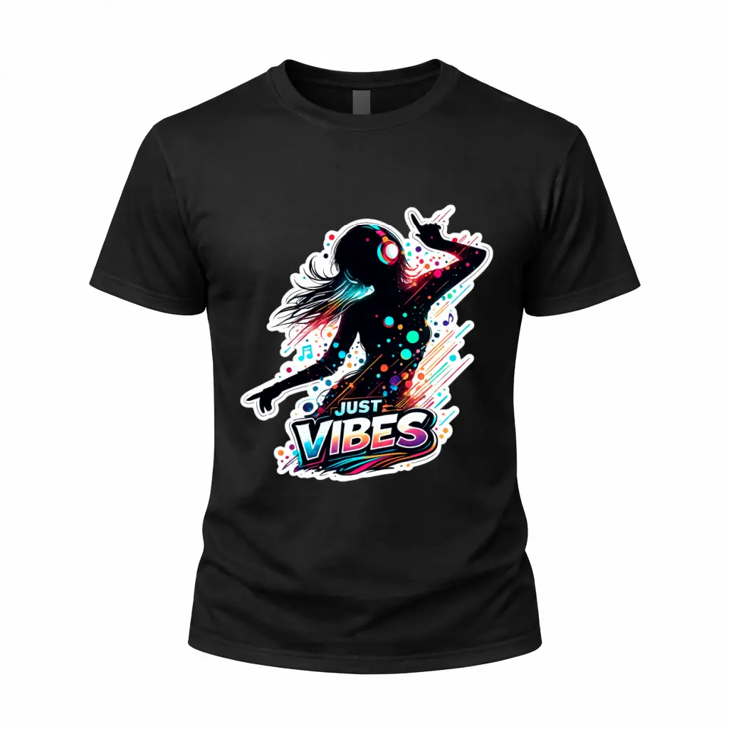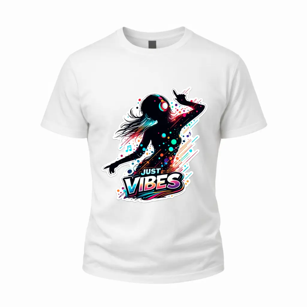 ·The shirt showcases a playful "Just Vibes" theme. It combines a dancing silhouette with music and headphones, making it a fun choice for any occasion. The graphic print adds a unique touch to your wardrobe, ensuring you stand out in a crowd.