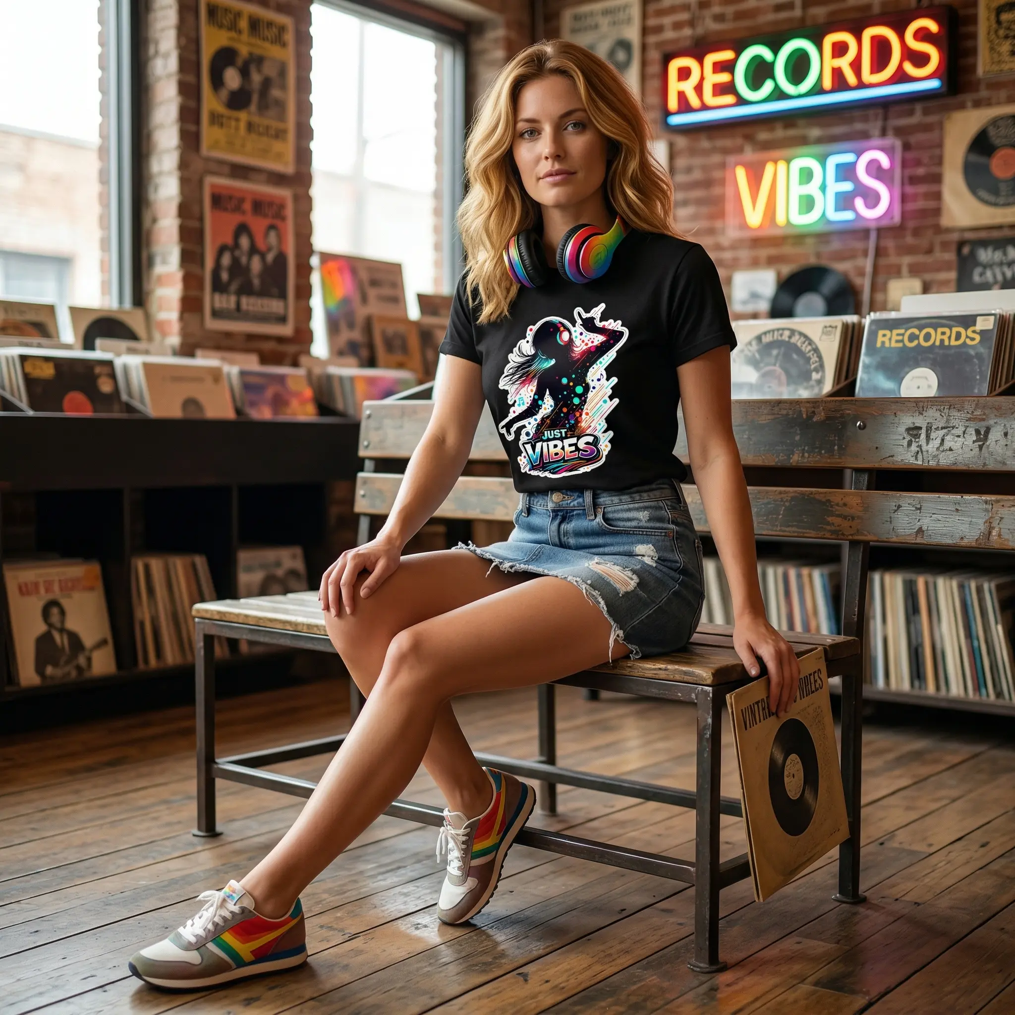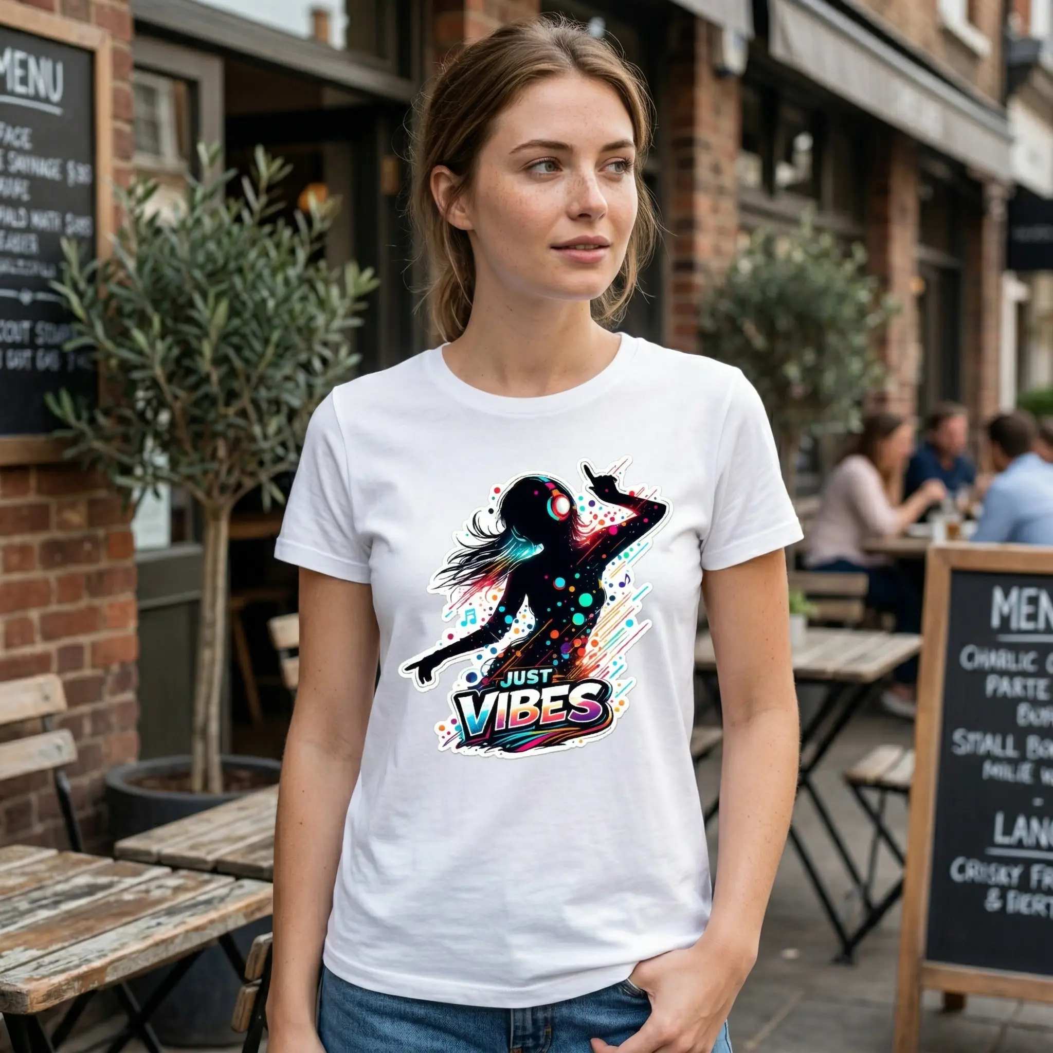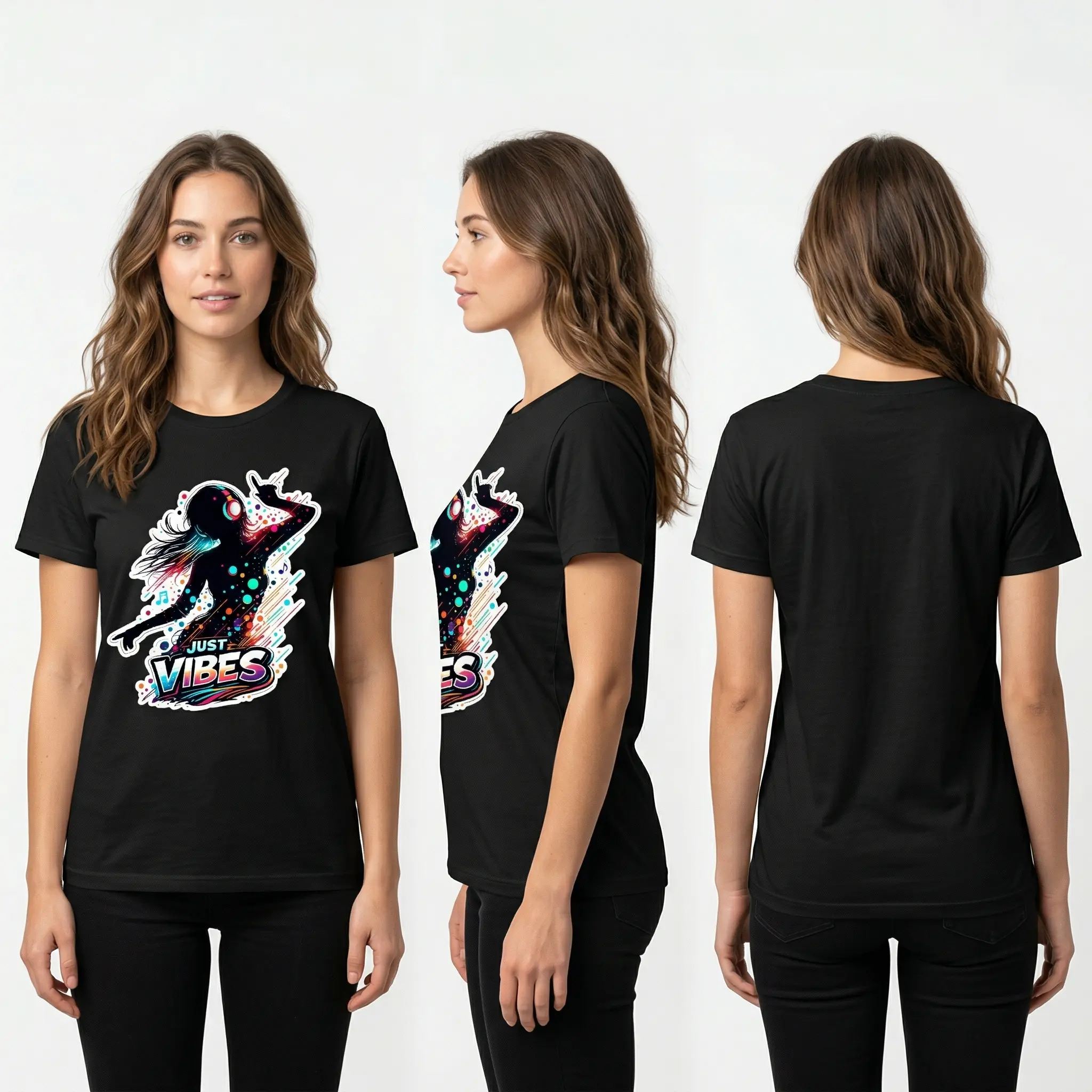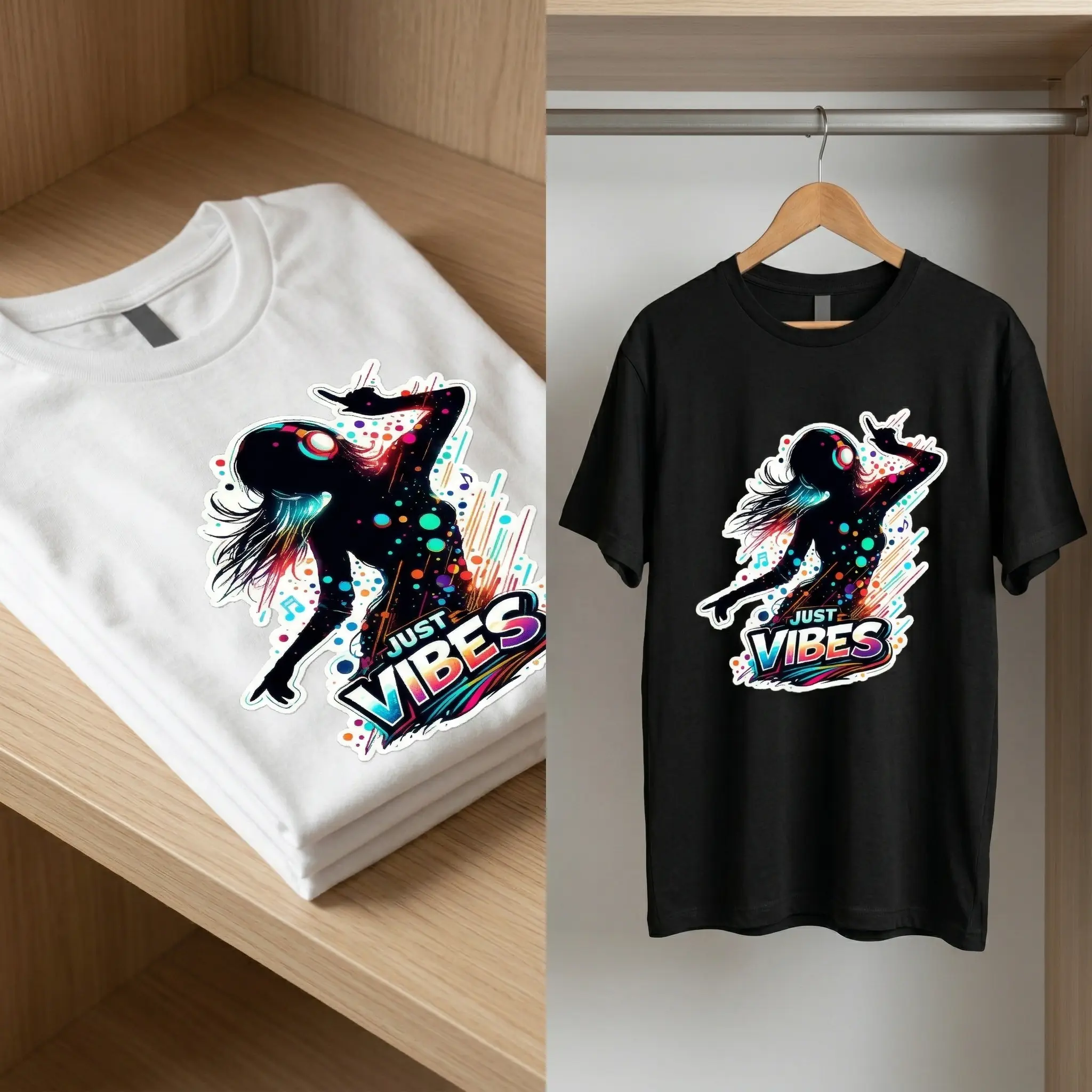 ·The shirt showcases a playful "Just Vibes" theme. It combines a dancing silhouette with music and headphones, making it a fun choice for any occasion. The graphic print adds a unique touch to your wardrobe, ensuring you stand out in a crowd.