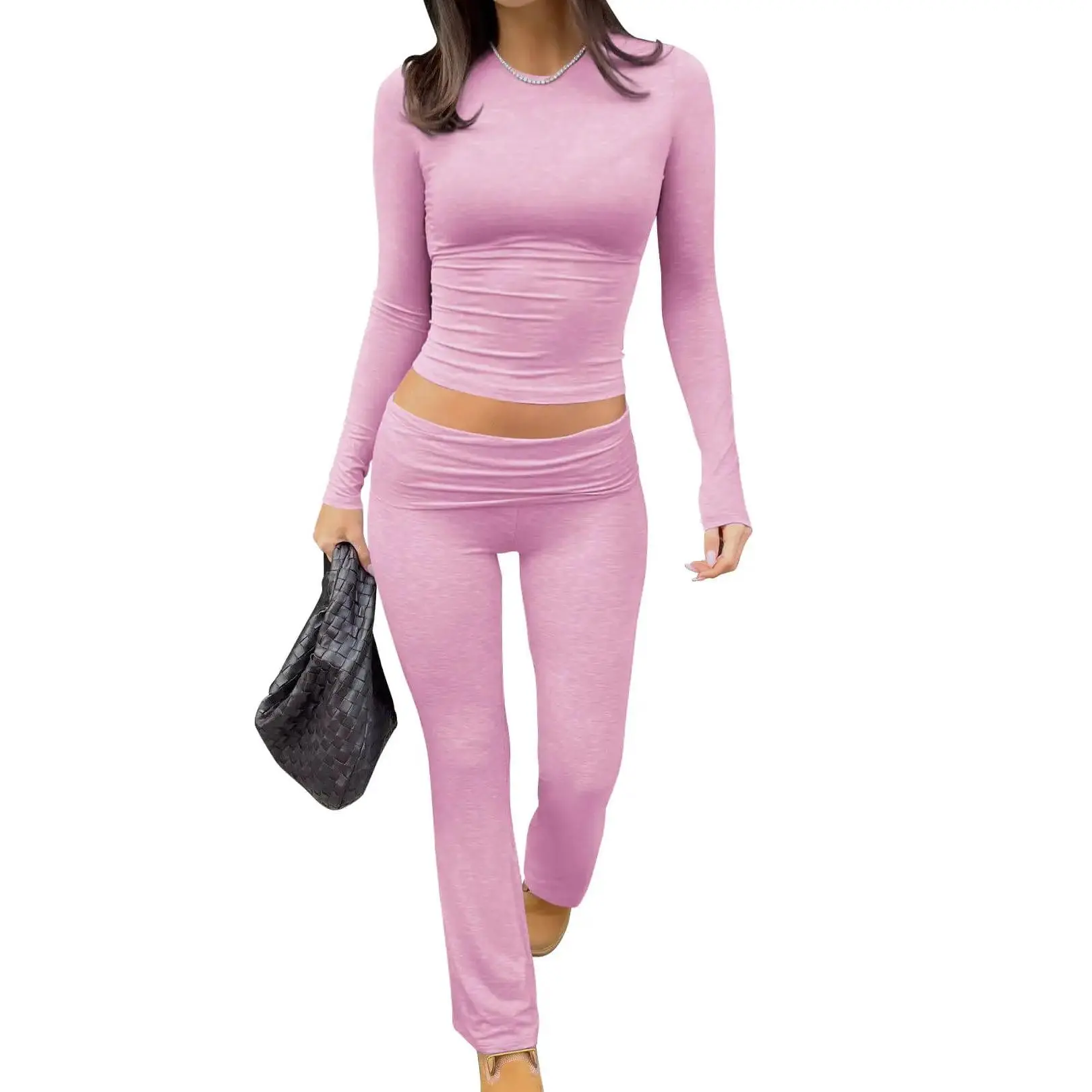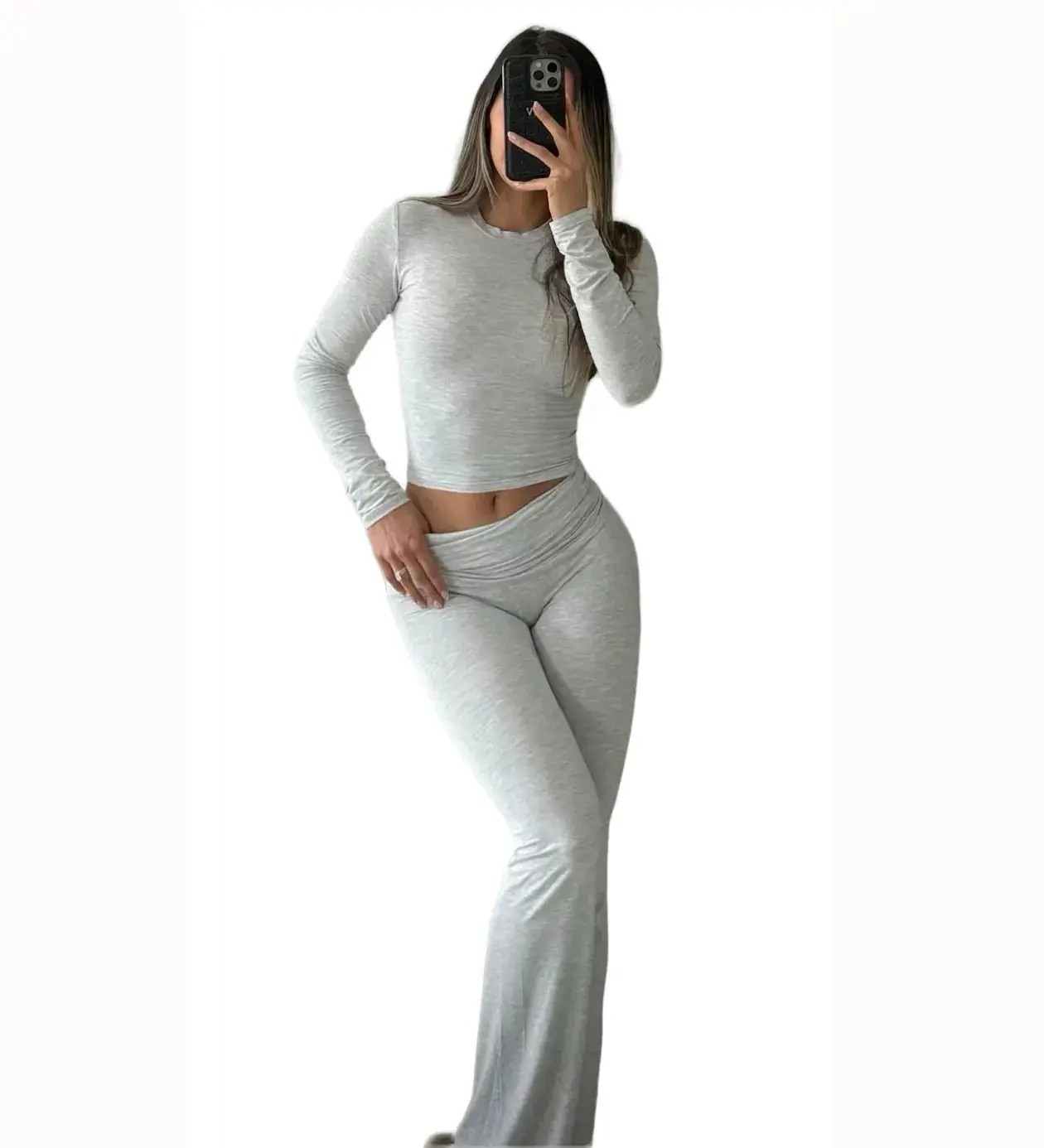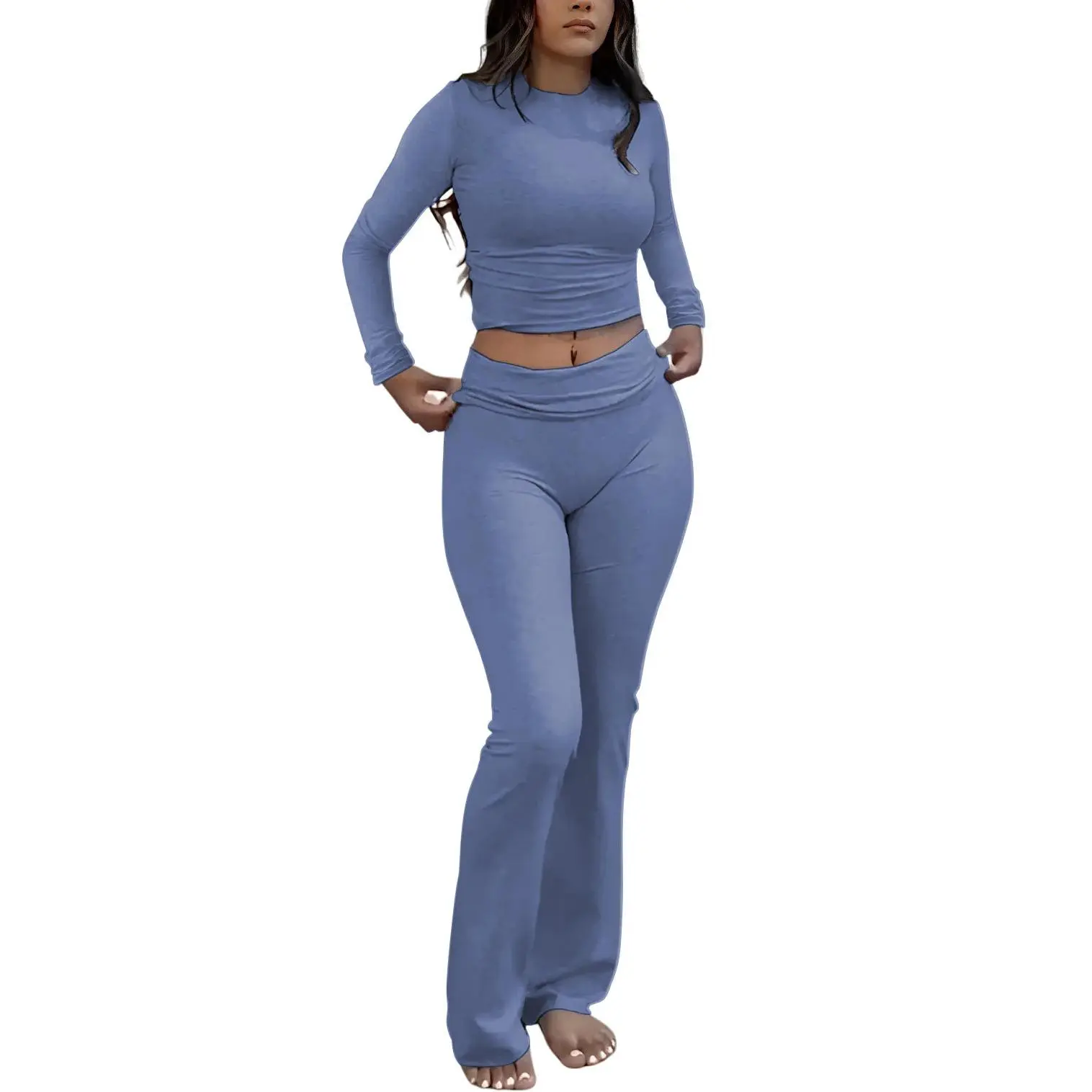 Long-sleeve crop top and wide-leg pants for comfort, mobility, and confident casual style at home or gym.