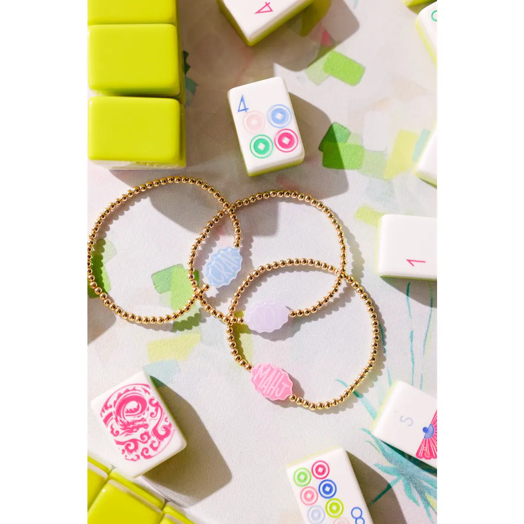 This is a 3MM gold beaded bracelet that features a custom acrylic Mahjong bead — the perfect accessory for game nights or anyone who loves a touch of playful charm! A fun and stylish piece inspired by the classic game. The stretch fit ensures easy, comfortable wear — perfect for stacking or wearing solo. A unique and thoughtful gift for Mahjong lovers and lucky ladies alike.