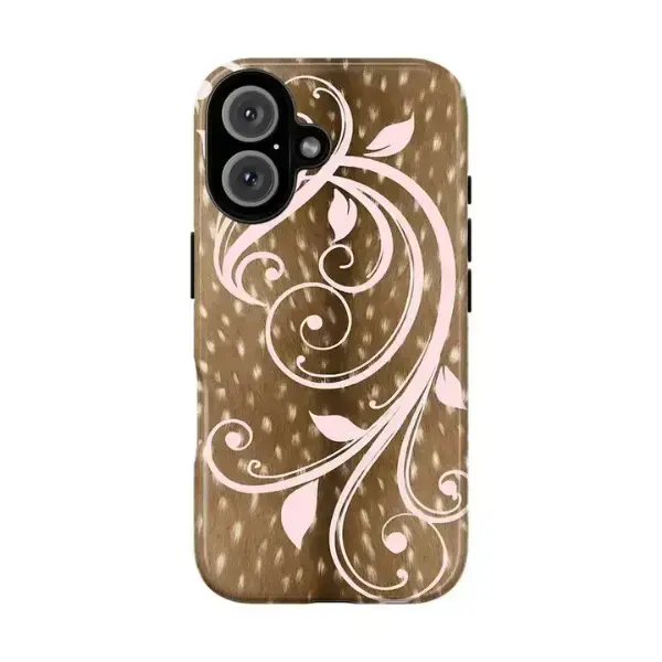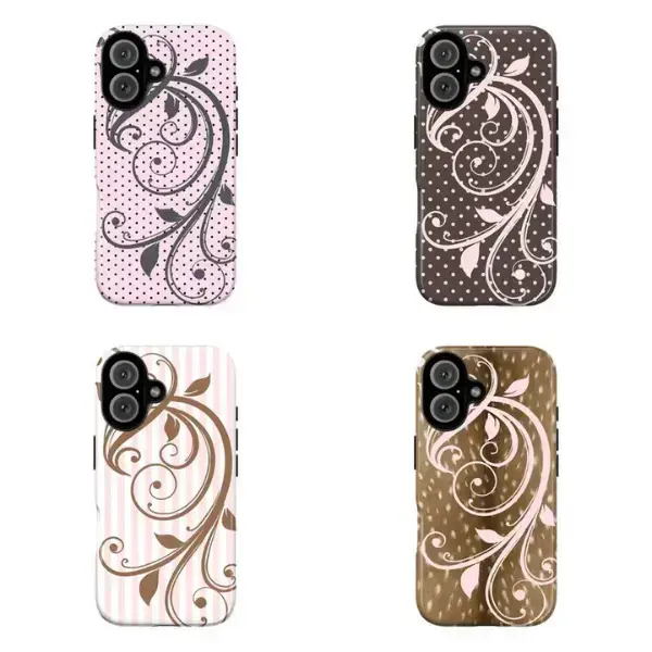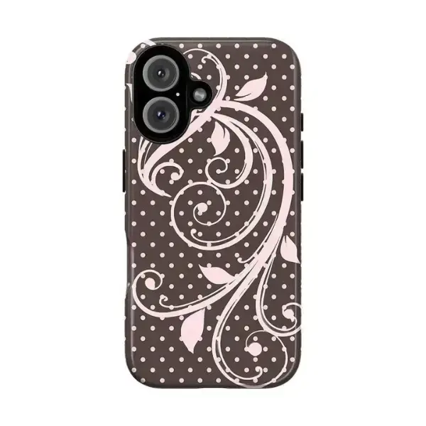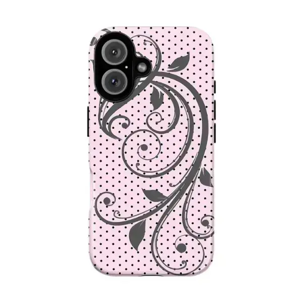 Aesthetic Floral Swirl Vintage Leaf Pattern Soft Pink Polka Dot Stripe Design Graphic Art Trendy Tough Phone Case. Cute Girly Coquette Aesthetic Heavy Duty Shockproof Protective Cover for iPhone 17 Pro Max 16 Air 15 14 13 12 11.