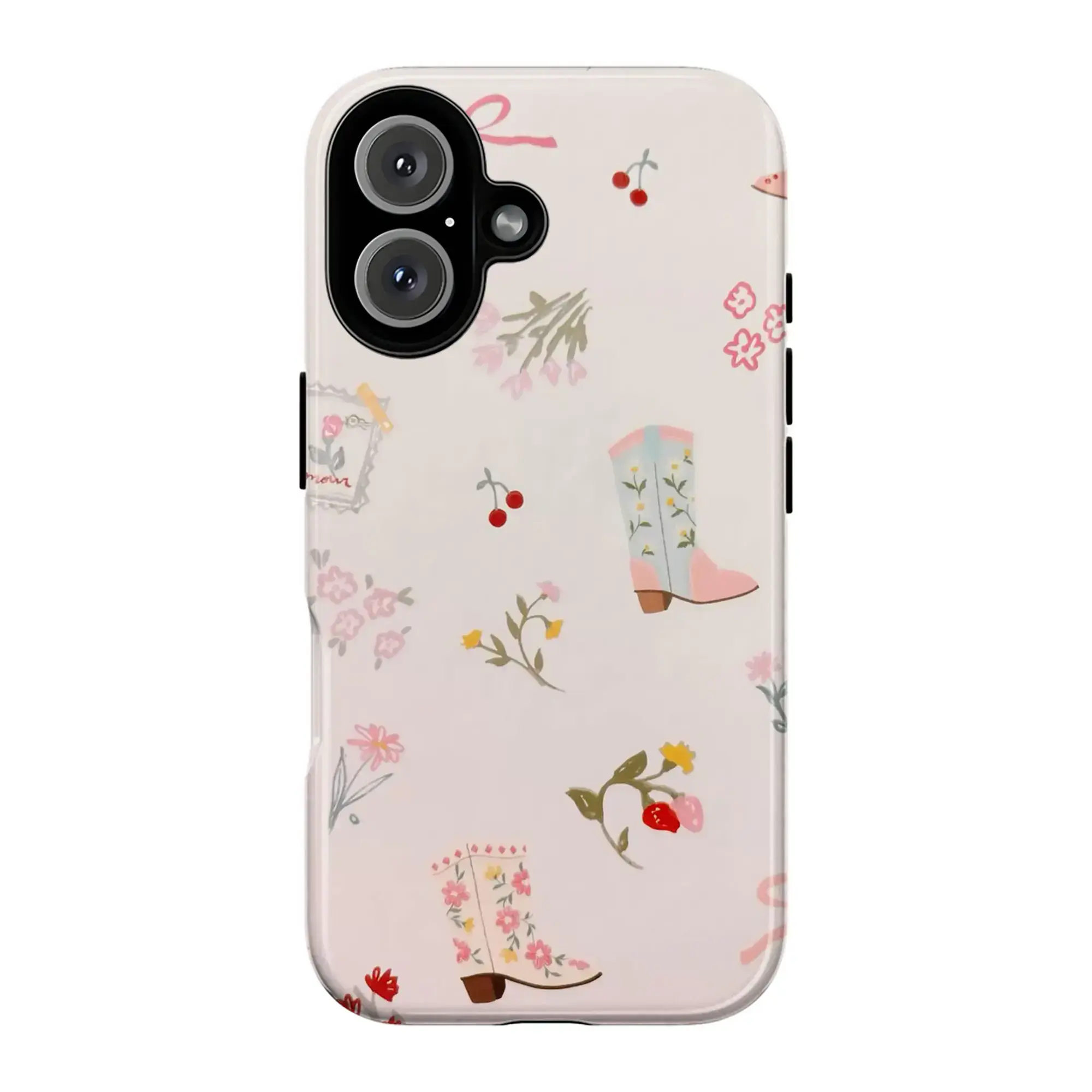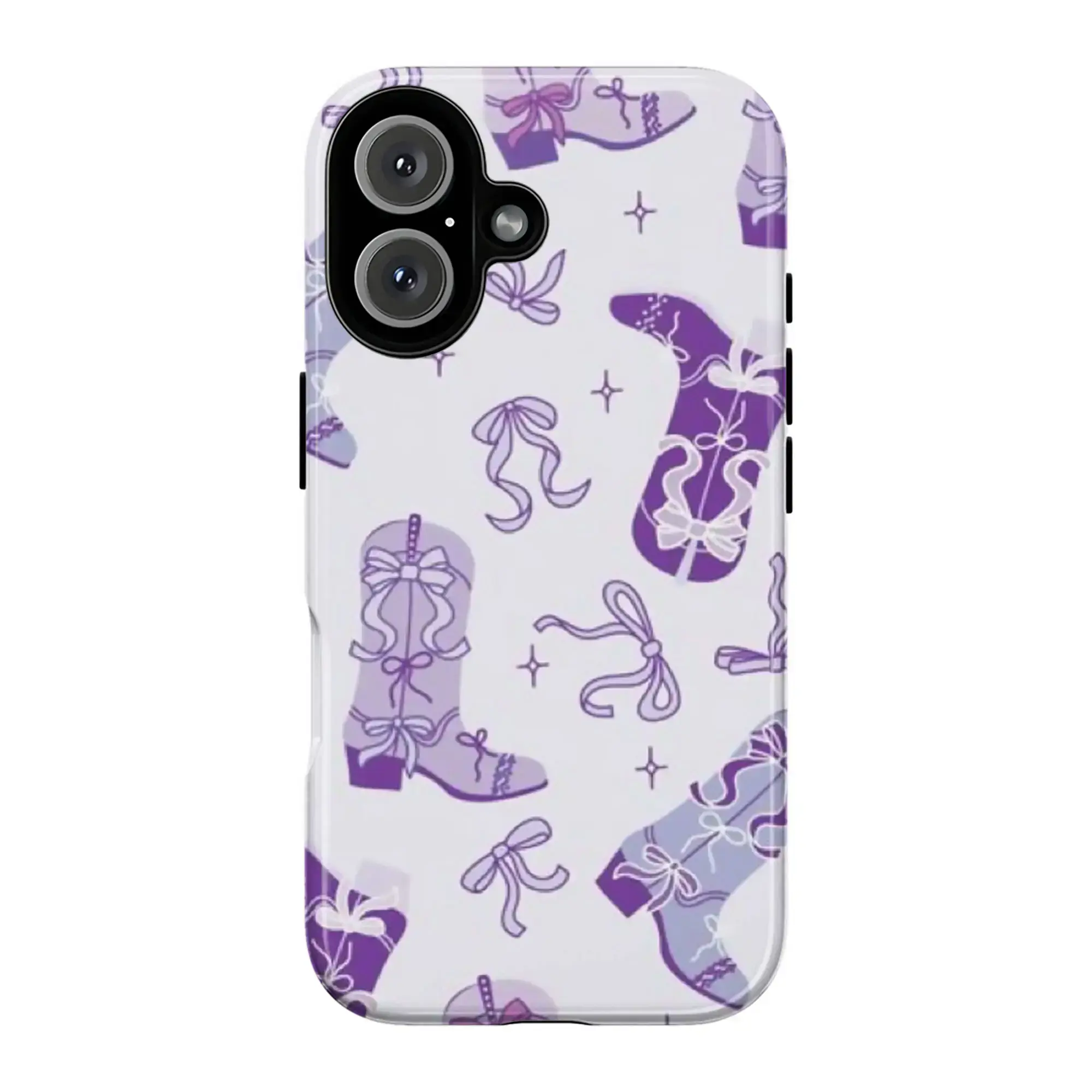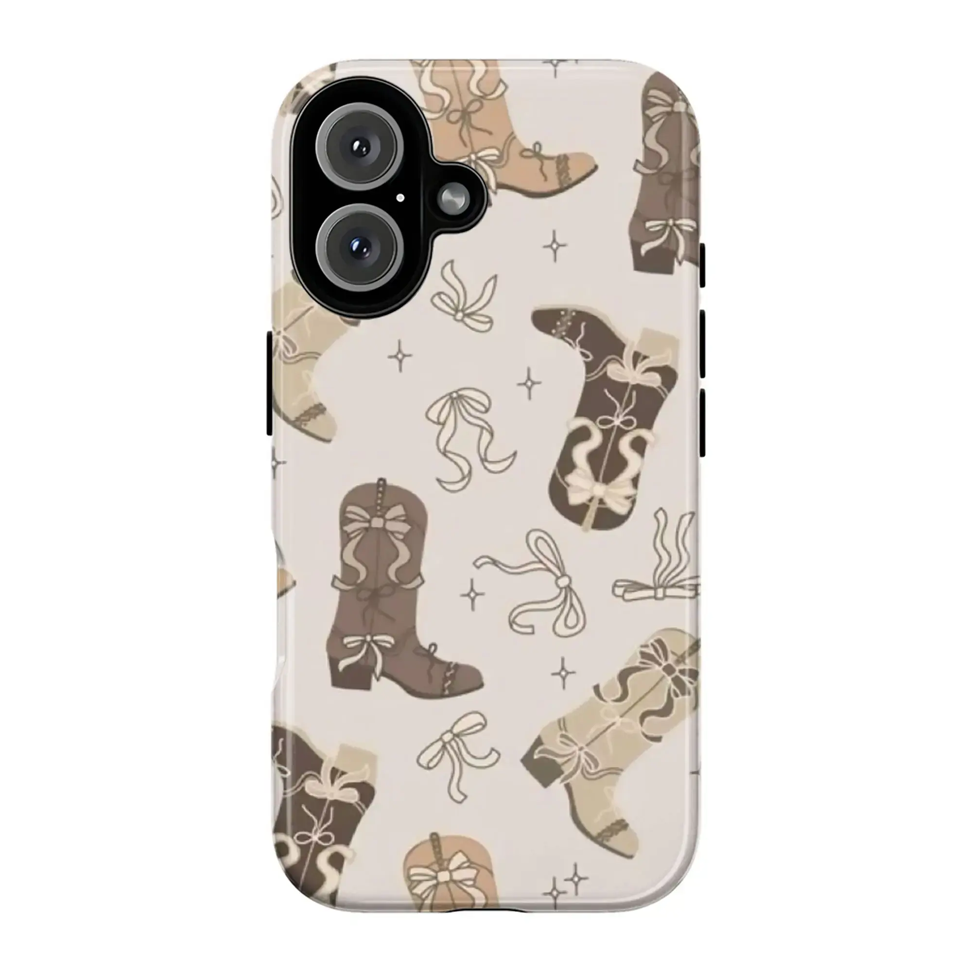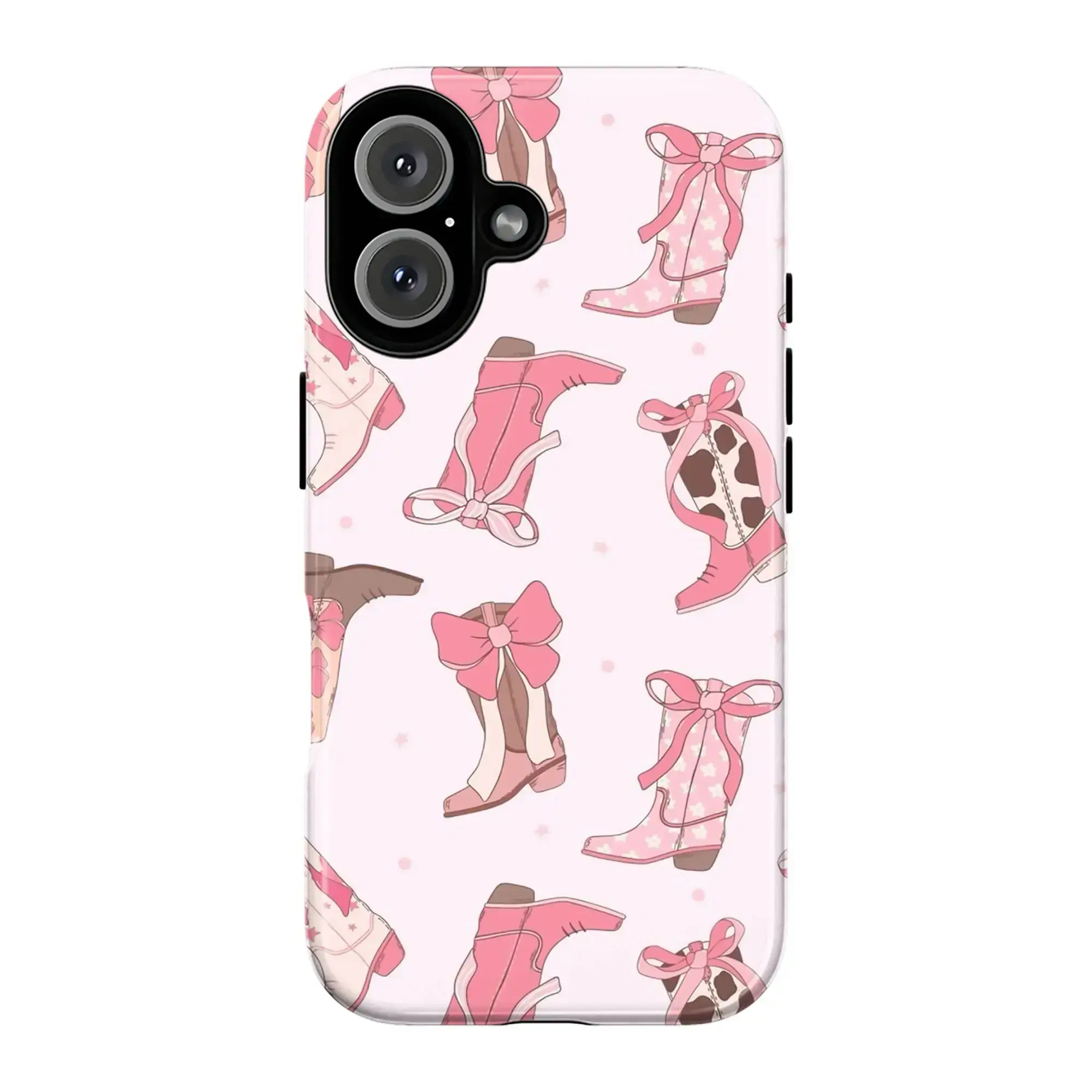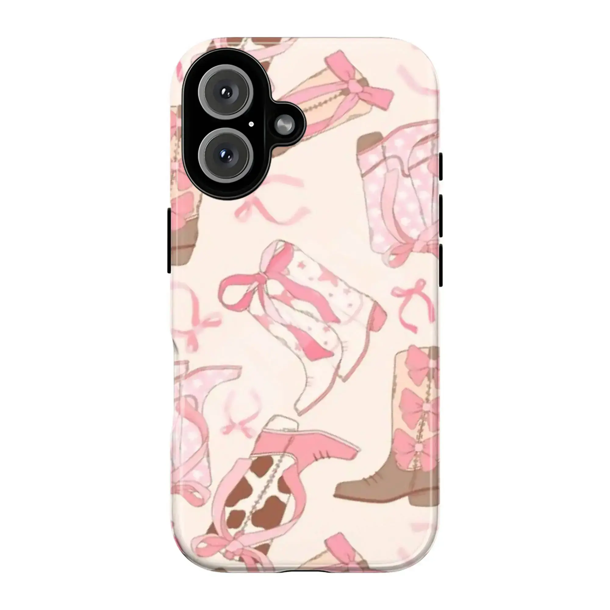 Coquette Western Bow Boots Pink Cowgirl Vintage Floral Ribbon Design Y2K Style Art Trendy Tough Phone Case. Sweet Girly Aesthetic Heavy Duty Shockproof Protective Smartphone Cover for iPhone 17 Pro Max 16 Air 15 14 13 12 11.