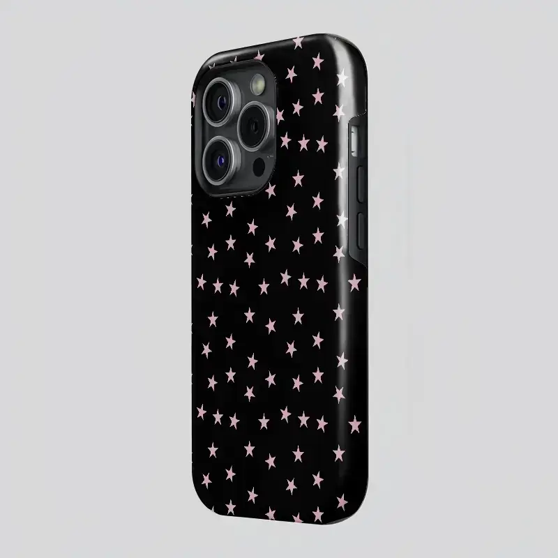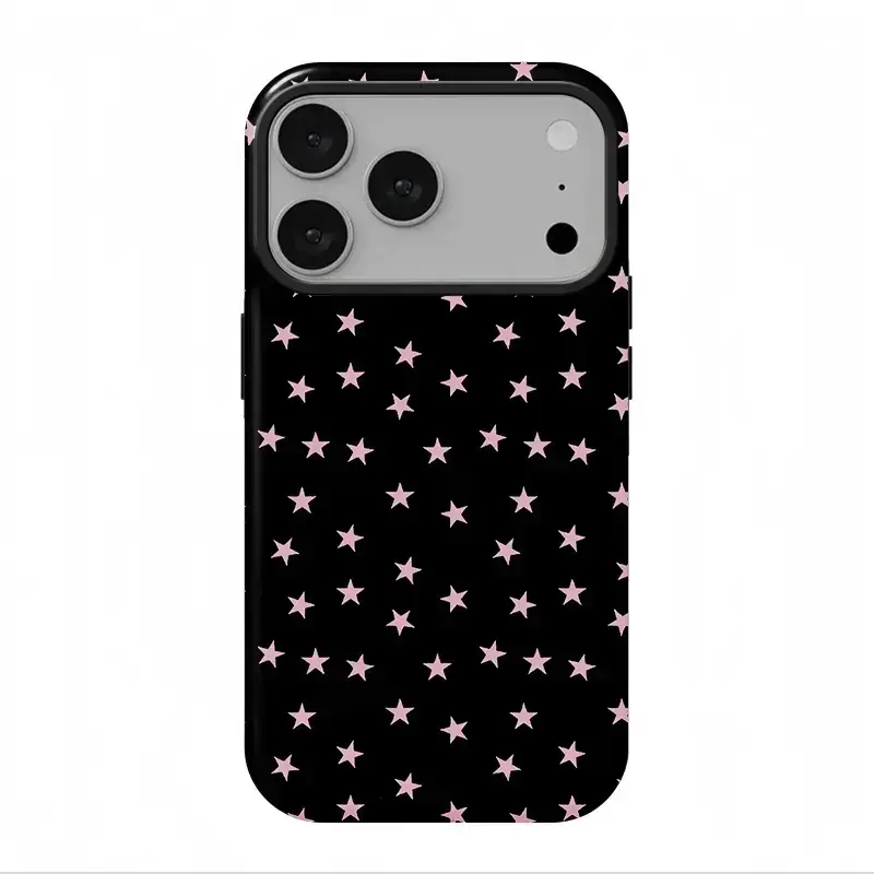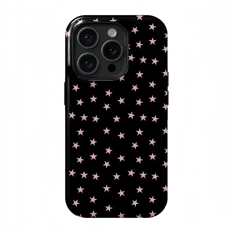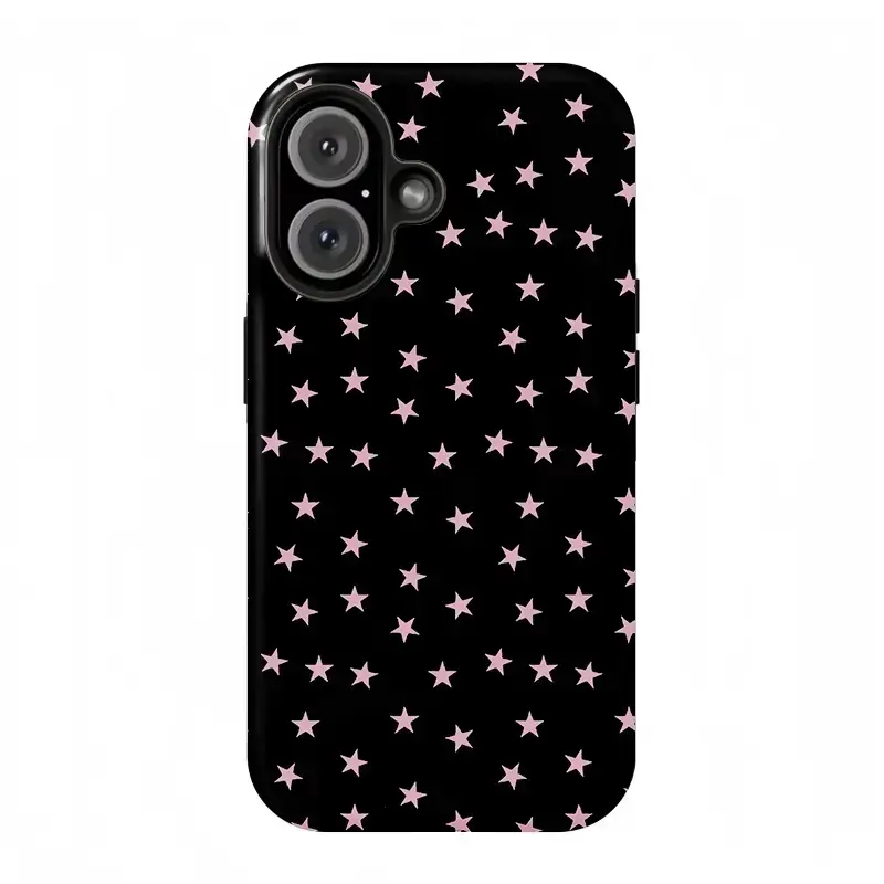 Black And Pink Star Pattern Cute Girly Minimalist Constellation Art Trendy Tough Phone Case. Edgy Coquette Aesthetic Heavy Duty Shockproof Protective Smartphone Cover for iPhone 17 Pro Max 16 Air 15 14 13 12 11.