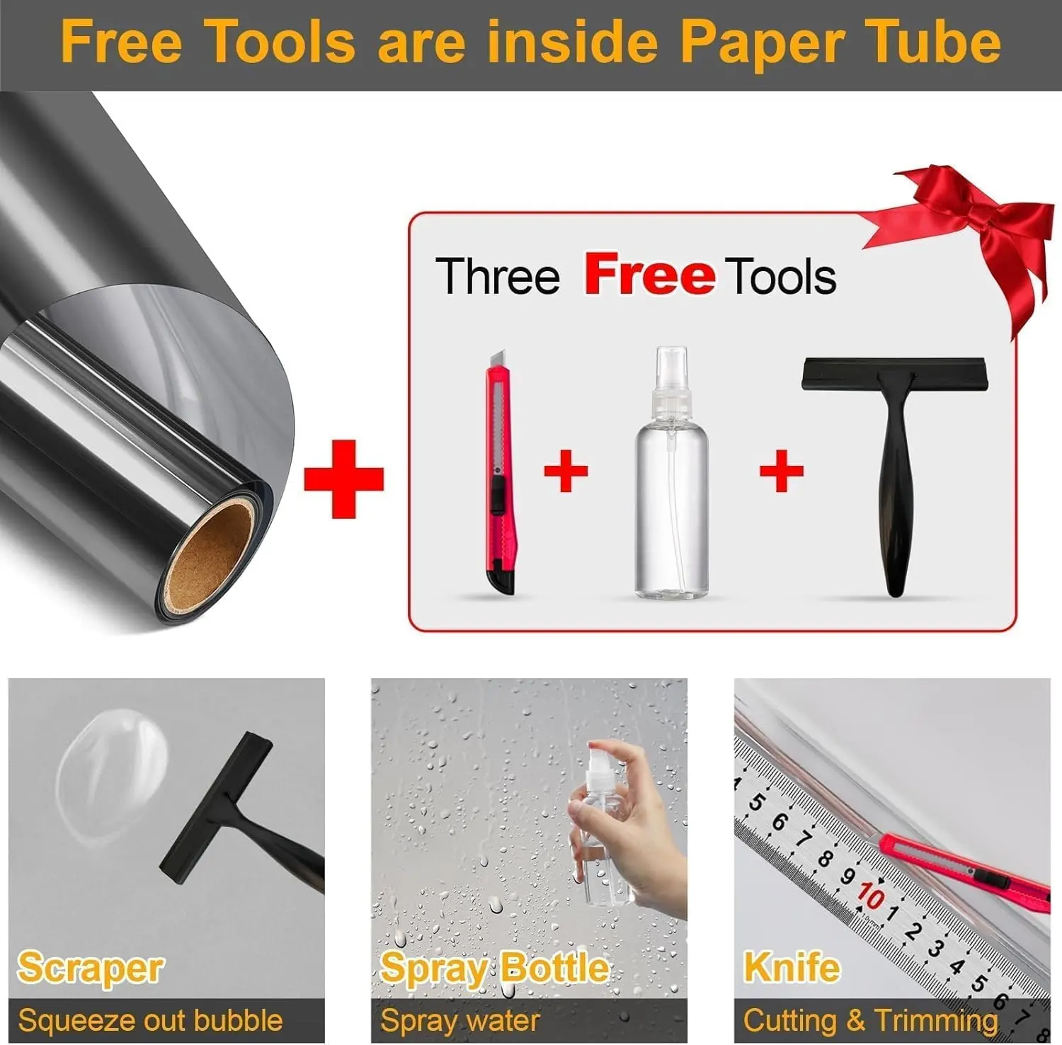 ·Note: 1. The protective film shall be removed before installing. 2. Please remove all excess water & bubbles in the end of installation steps. 3. The free tools are inside the paper tube.4. The window tint can’t be used in frosted glass, cut glass and all of processed non-smooth surface glass.