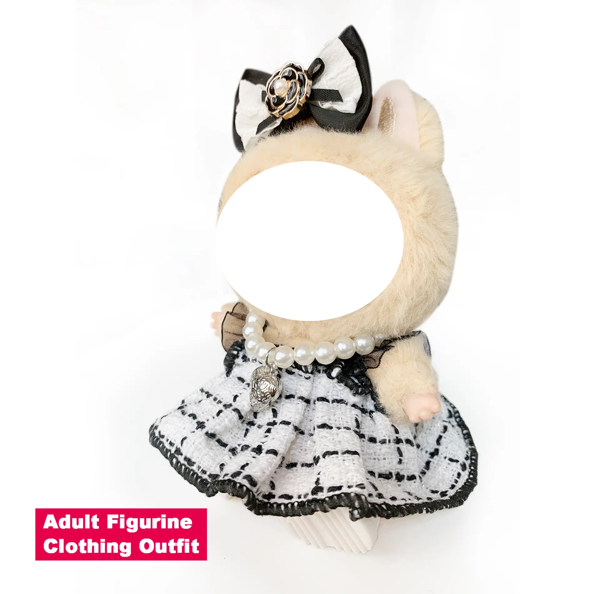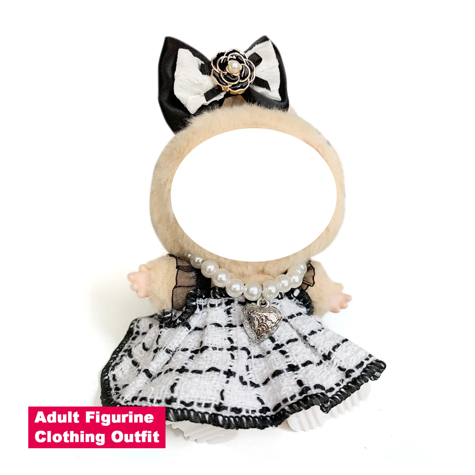 Elegant Tweed Pearl Dress Outfit for Adult Collectible Plush Figurines, Luxury Black & White Plaid Costume with Bow, Aesthetic Accessory for Shelf Styling & Custom Display