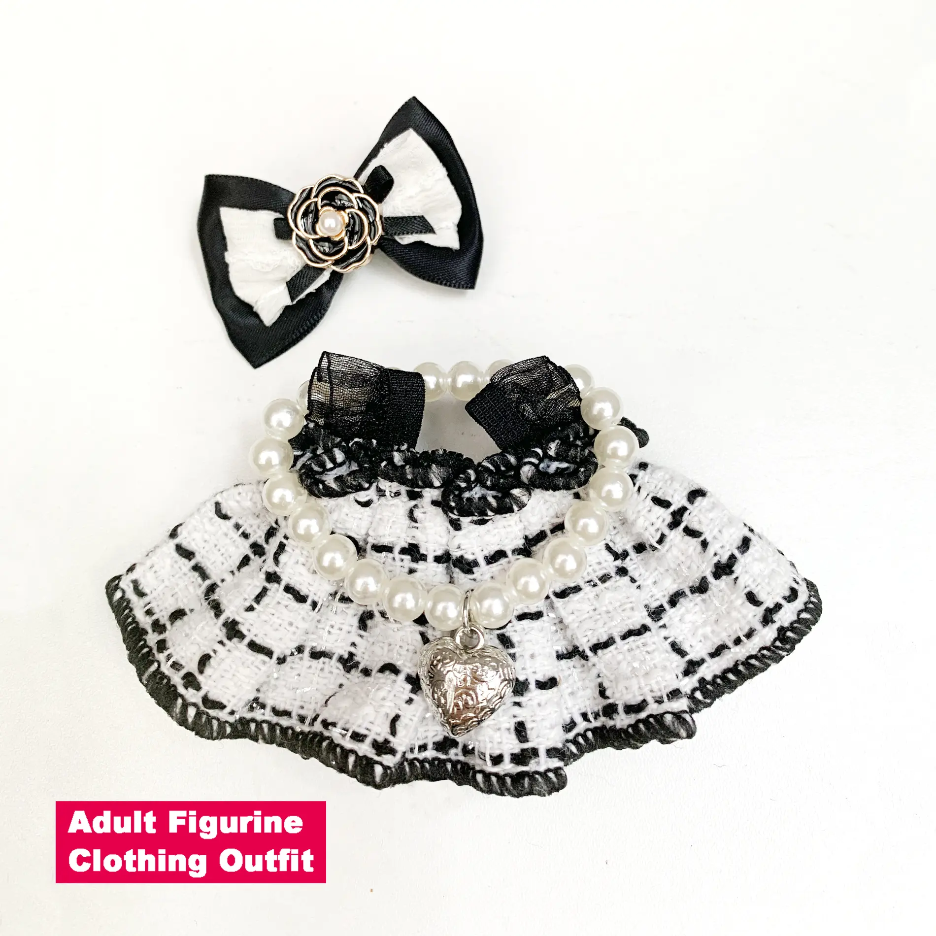 Elevate your adult collectible figurine collection with this luxury-inspired tweed dress outfit, perfect for adding a sophisticated, on-trend touch to your curated display. Made with premium textured tweed fabric, this set features a classic black-and-white plaid dress with scalloped trim, a statement pearl necklace with a silver charm, and a matching bow adorned with a floral accent.