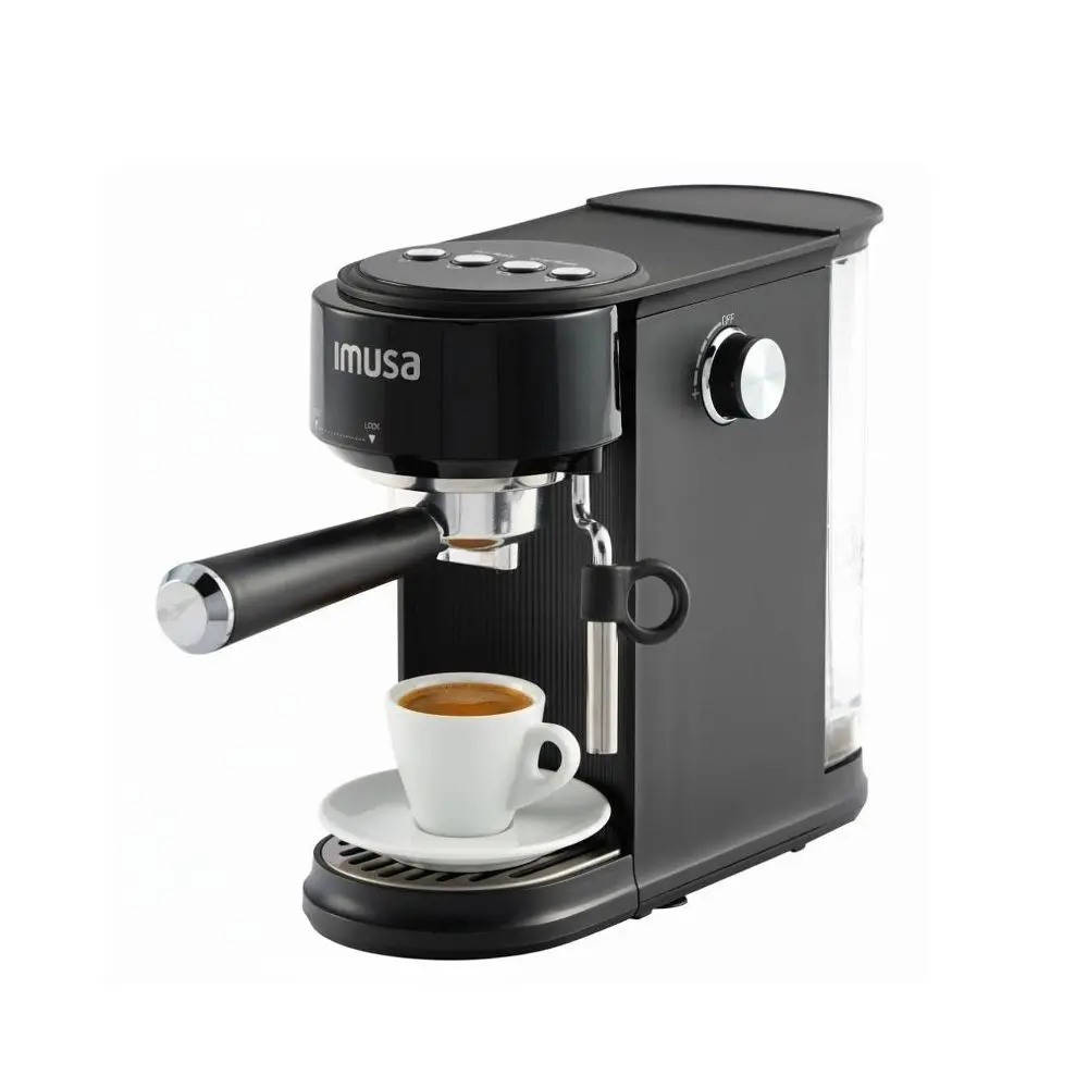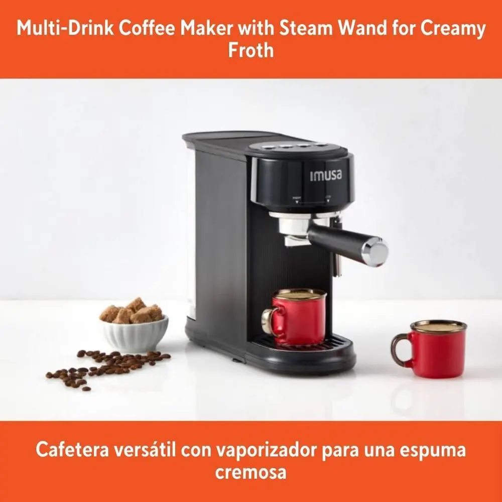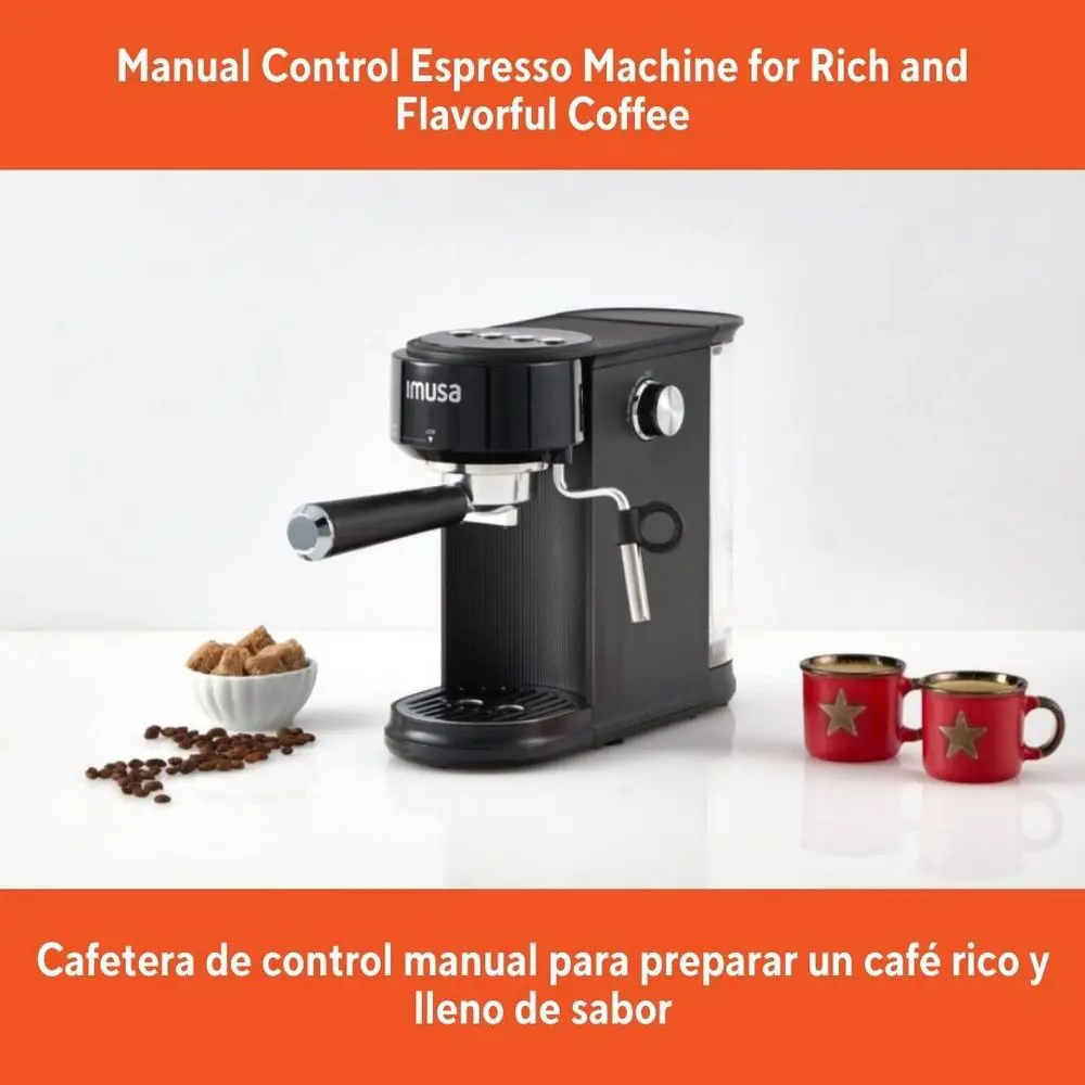 The IMUSA Espresso Machine is your go-to companion for rich, café-style drinks at home. With a sleek matte black exterior and compact design, it fits perfectly in small kitchens, offices, or limited countertop spaces. Made of durable plastic, it delivers bold, flavorful coffee in seconds with 20 bars of pressure and a thermoblock system that heats water instantly. The manual control panel includes options for Power, 1 Cup, 2 Cups, and Steam for milk frothing, plus hot and cold brew settings. Perfect for espresso, cappuccinos, lattes, macchiatos, moka, and more. Trust the IMUSA Espresso Machine for balanced, home-cooked meals. It will surely become your kitchen's beloved companion, uniting tradition and innovation in every delectable creation and elevating your culinary experience.
