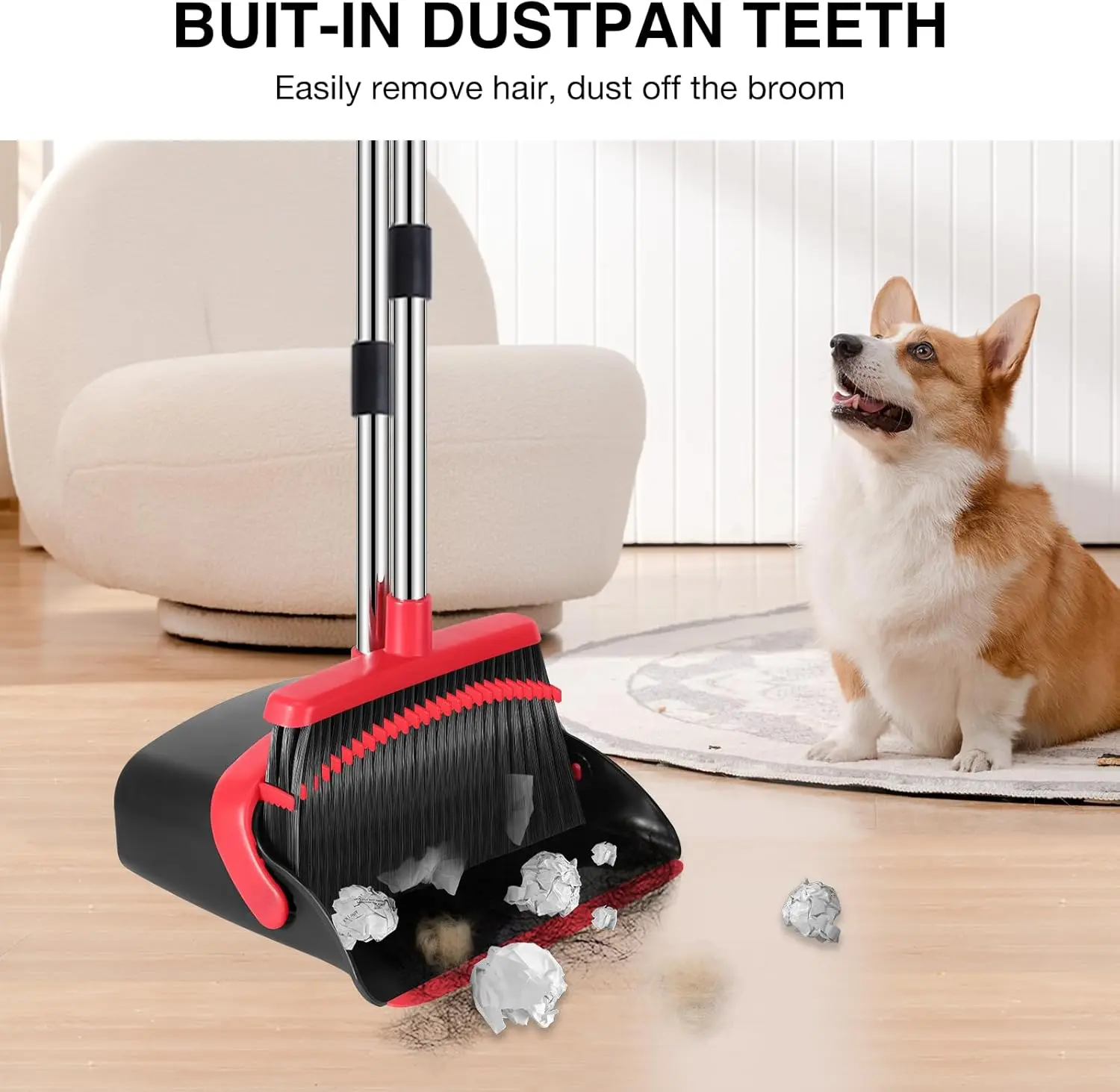 Designed with a long, adjustable handle, this set lets you clean without bending, reducing strain on your back while reaching every corner with ease. The built-in dustpan teeth automatically remove hair and debris from the broom, making it perfect for handling pet hair, dust, and everyday messes.