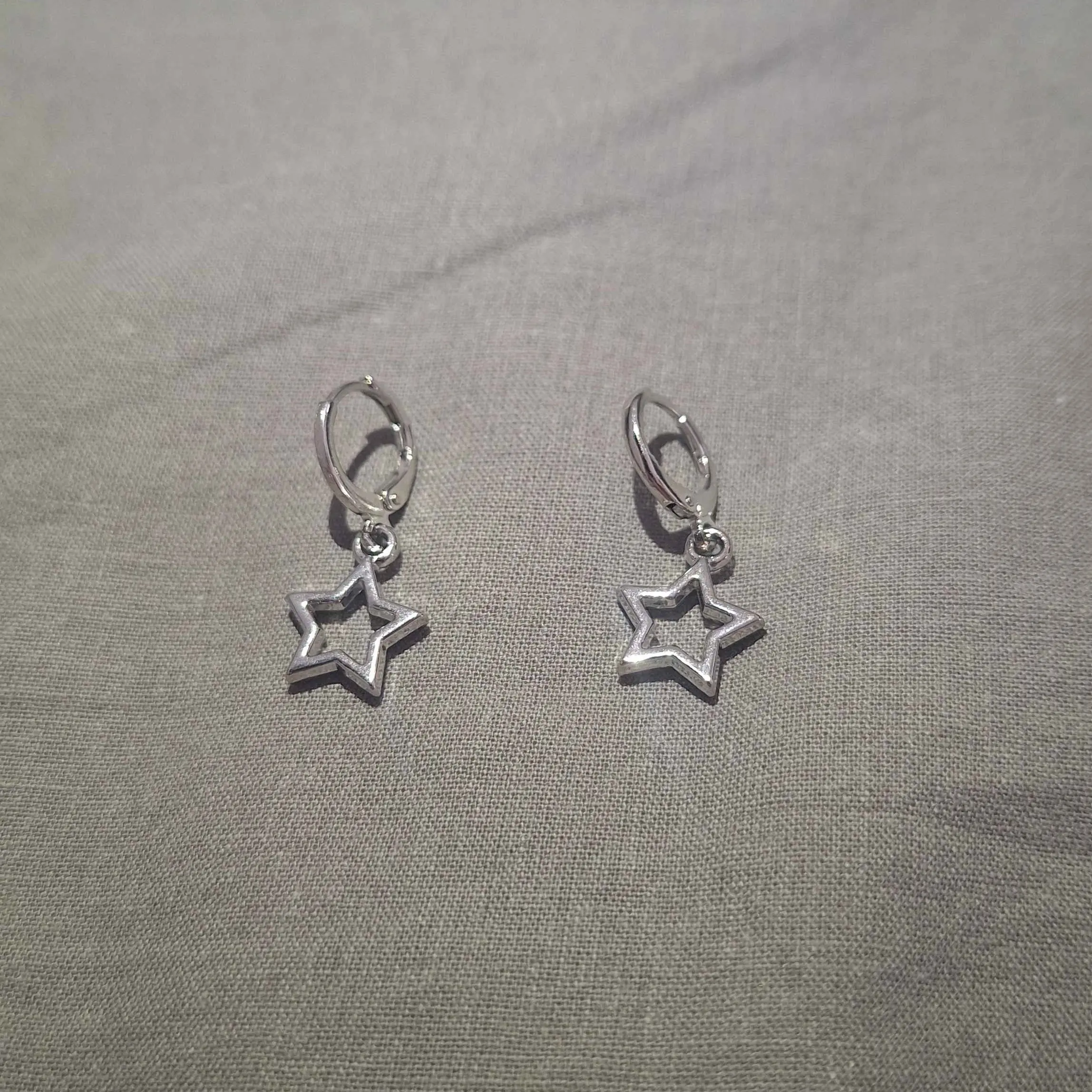 Silver-tone Y2K hoop earrings featuring small dangling star charms. Lightweight and comfortable for everyday wear with a secure hinged closure. Made from zinc alloy and nickel-free, suitable for sensitive ears. A simple and stylish accessory that pairs well with casual, Y2K, or dressy outfits.