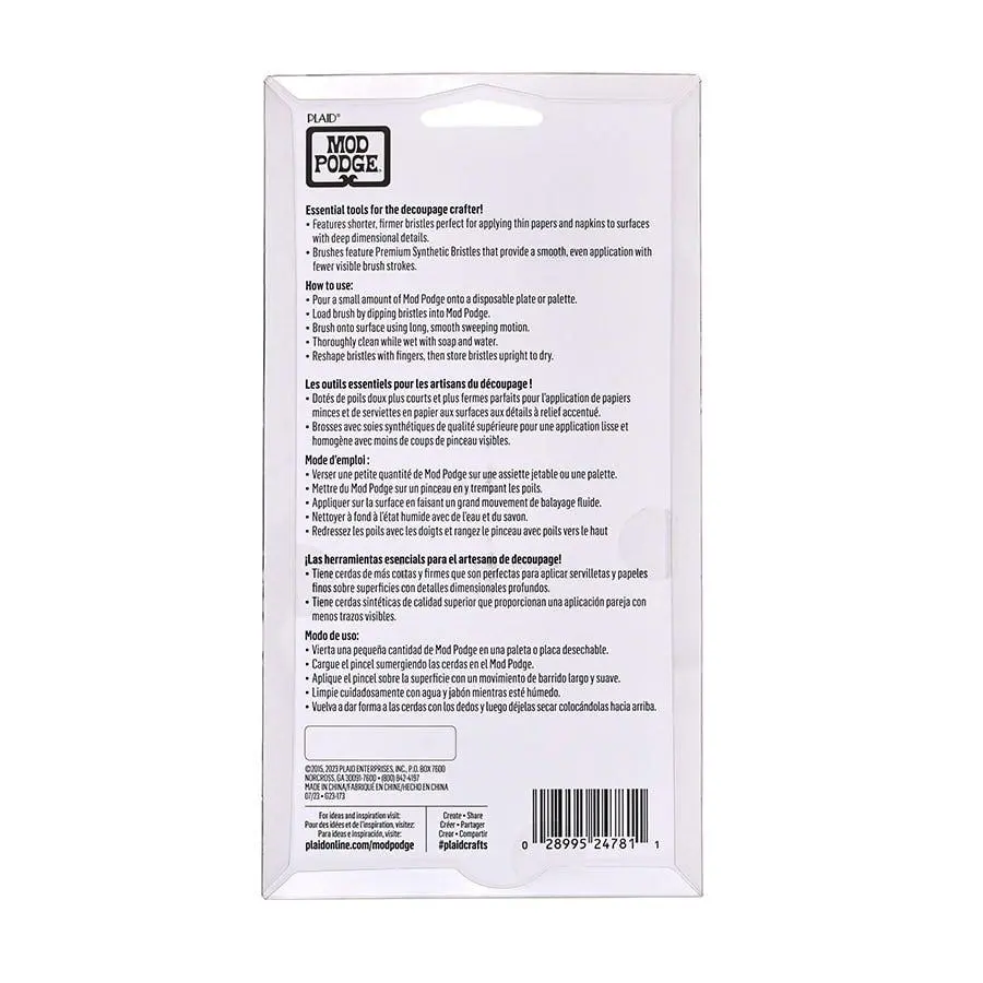 The Mod Podge 3 pc Firm Decoupage Brushes feature shorter, firmer bristles perfect for applying thin paper and napkins to surfaces with deep dimensional details. The set includes three brush sizes: 1¼", 11/16" and ⅜". Brushes feature Premium Synthetic Bristles that provide a smooth, even application with fewer visible brush strokes. The short Premium Synthetic Bristles are ideal for ornate surfaces, and make pressing paper or fabric into creases and tight corners a breeze. The brushes clean up readily with soap and water. For best results, be sure to reshape the brushes after washing and before standing brush-side up to dry.