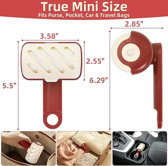 ·Mini travel size measures 5.5” × 3.58” × 2.85”. Ideal as a purse, pocket, or car lint roller. Lightweight and portable for travel, office, or daily use. Stay organized and clean on the go.