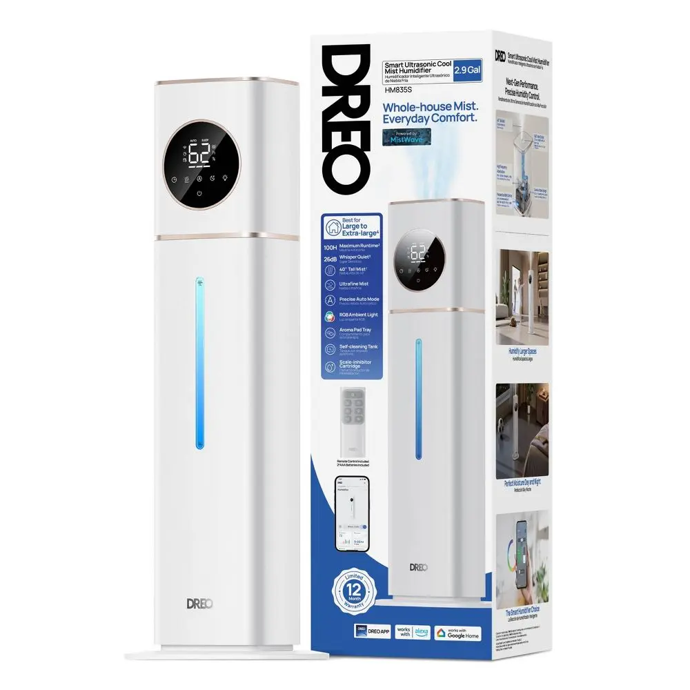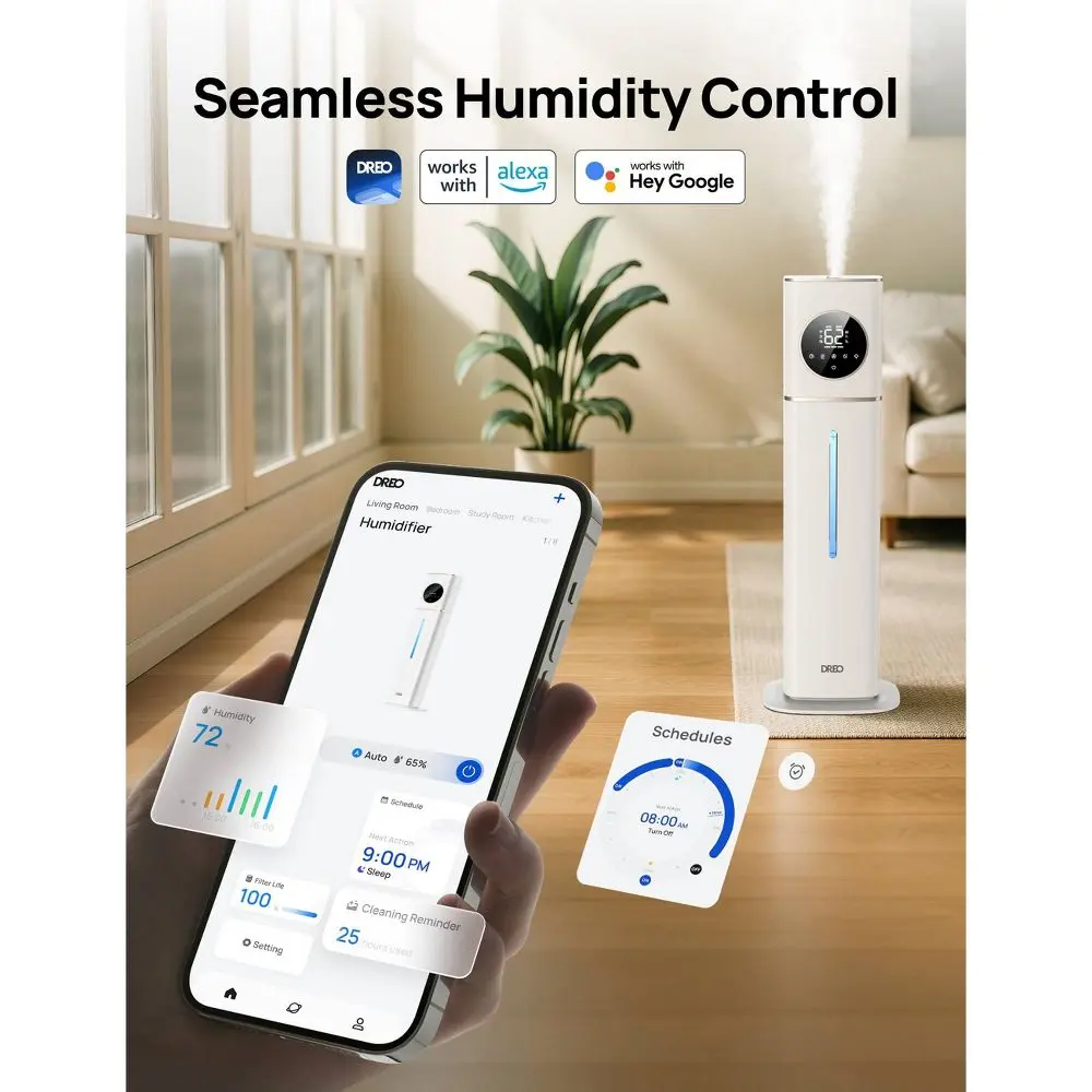 Experience ultimate comfort with the DREO Smart Cool Mist Humidifier, designed to effortlessly humidify large rooms up to 700 sq. ft. Its spacious 11L tank provides up to 100 hours of continuous hydration, while advanced atomization technology delivers a fine, even mist and helps keep surfaces dust-free. With ±5% precise humidity control, your ideal environment is always within reach. Effortless operation is guaranteed thanks to remote, voice, and app controls, allowing you to set schedules and receive cleaning reminders from anywhere. Bring reliable, whisper-quiet moisture to your home for healthier air and lasting comfort.
