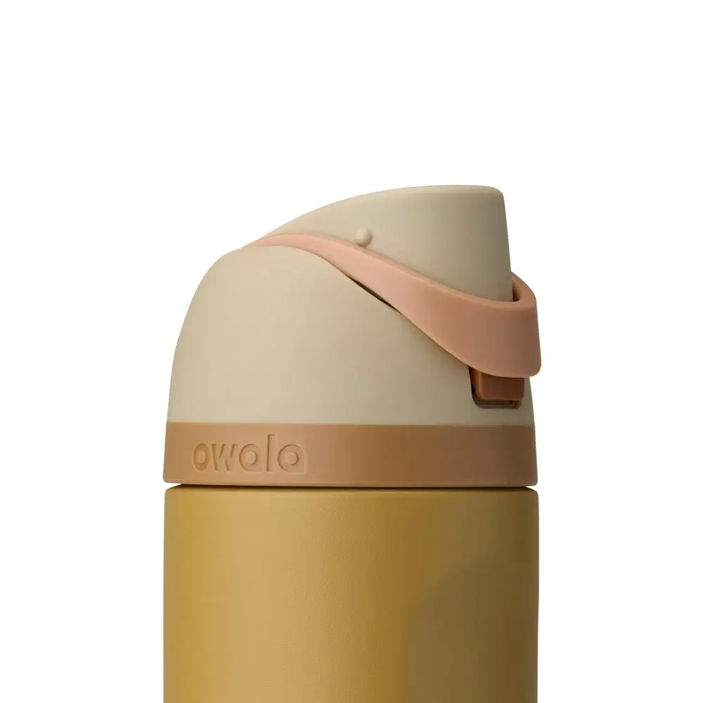The Owala FreeSip Insulated Stainless-Steel Water Bottle with Locking Push-Button Lid easily tackles every thirst. With a built-in, easy-clean straw and a wide-mouth opening, the FreeSip reusable bottle is designed for drinking two different ways: sipping upright through the straw or tilting back to swig from the wide-mouth spout opening. Add in a push-to-open lid and playful colors, and staying hydrated has never been simpler—or more fun. Additional features include double-wall insulated stainless steel that keeps drinks cold up to 24 hours, a carry loop that doubles as a lock, a cup holder-friendly base, and a wide opening for easy cleaning and adding ice. The Owala FreeSip Insulated Stainless-Steel Water Bottle with Locking Push-Button Lid is available in four sizes: 16-Ounce, 24-Ounce, 32-Ounce, and 40 Ounce. Lid is dishwasher safe; recommended hand wash the cup. Not for use with hot liquids.