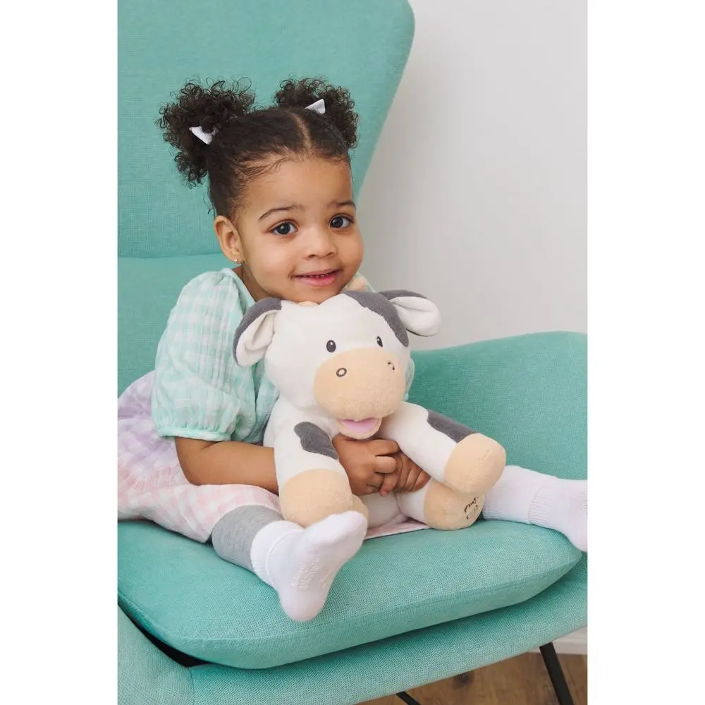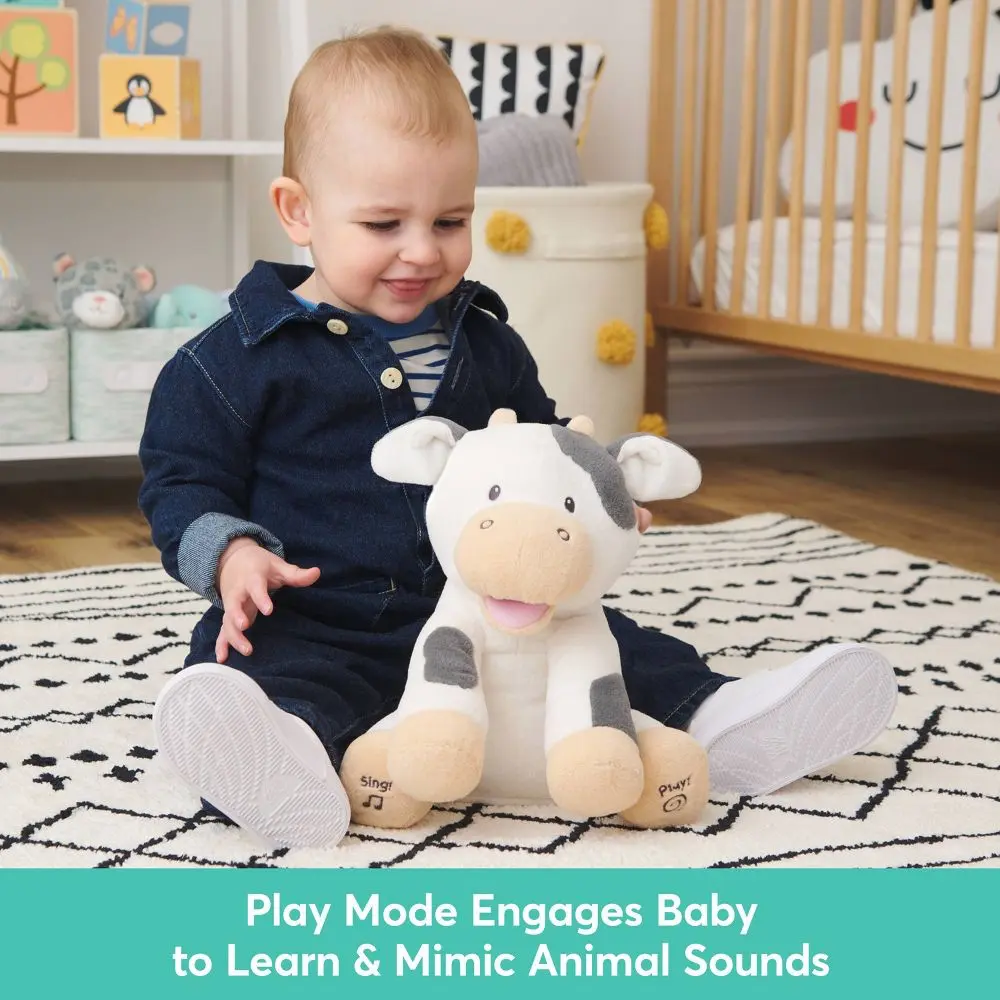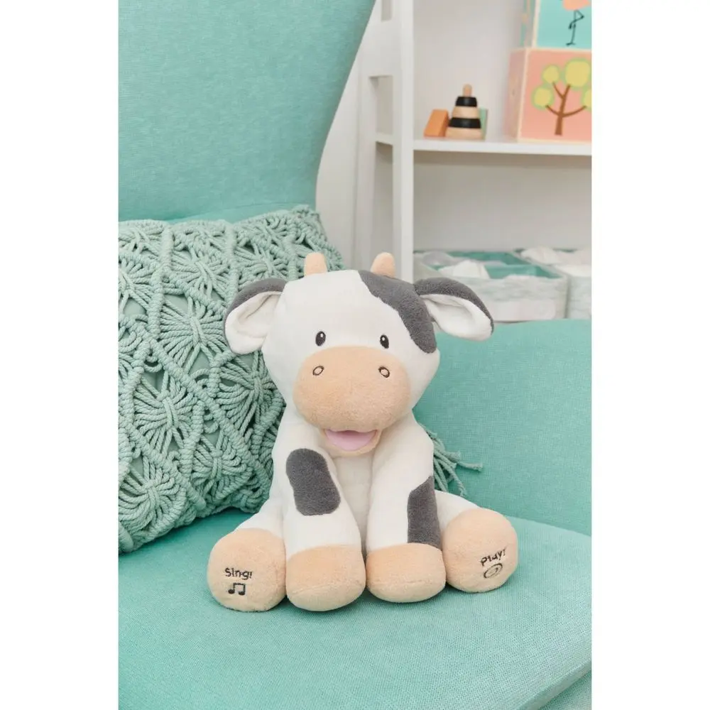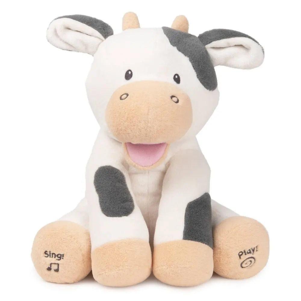 Sing and learn all about animal sounds with Buttermilk! Buttermilk is the latest addition to our family of Baby GUND animated plush friends, elevating playtime with new songs and interactive games! Press Buttermilk’s left foot to engage her in a fun, interactive animal-sound guessing game while her mouth moves in time with the lyrics. Press her right hoof to sing along to “Old MacDonald Had a Farm” in a cute child’s voice while her ears wiggle to the rhythm! This impressive plush cow even has over 20 whimsical interactive phrases in Play Mode, providing exciting and unique experience each time for little ones play! This adorable animated plush cow features soft, huggable spotted cream-colored fur with floppy arms and ears that wiggle gently during play. Babies will love singing along with their companion to “Old MacDonald Had a Farm” in song mode and learning about different farm animal sounds in play mode, encouraging their sensory development. Appropriate for children ages 6 months and up. Each cow plush requires 3 AA batteries, which are included for fun right out of the box. Surface washable; ships in a protective poly bag. Includes: 1 Baby GUND Buttermilk the Cow Animated Plush, Poly Bag