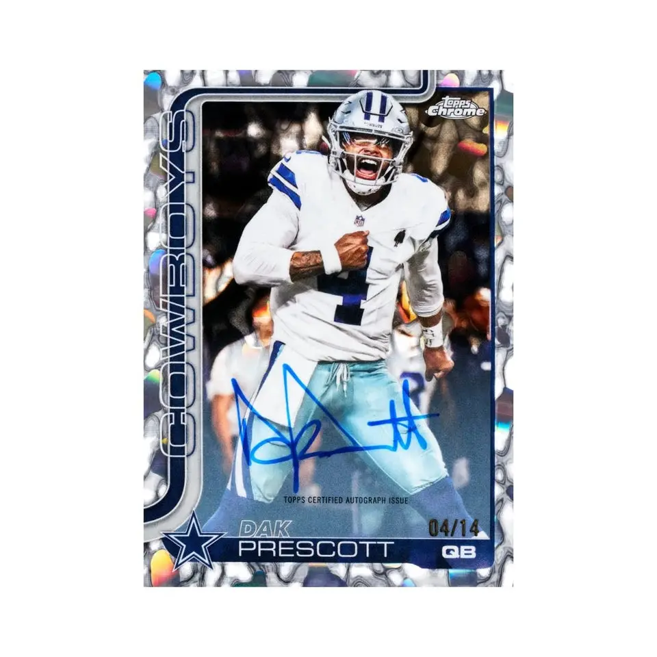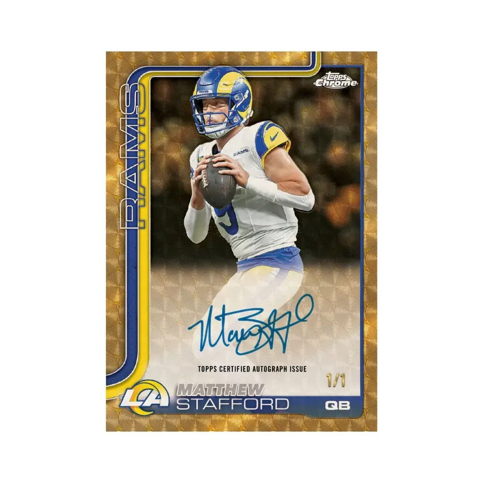 Where the game’s biggest names meet iconic Chrome shine. Featuring a dynamic mix of rookies, superstars, and legends, these coveted autographs are amplified by the full Chrome rainbow—including ultra-rare, low-numbered parallels built for the ultimate chase. Look for signatures from Tom Brady and Barry Sanders, current stars like Josh Allen and Jahmyr Gibbs, rising talent such as Jaxson Dart and Tetairoa McMillan.