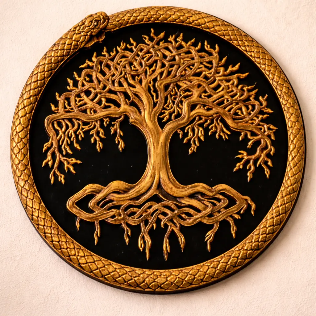 Bring the power of Norse mythology into your home with this striking Yggdrasil Ouroboros Wall Mount. This unique piece features Yggdrasil, the World Tree, encircled by the Ouroboros serpent, symbolizing the eternal cycle of life, death, and rebirth. The intertwining design blends ancient symbolism with modern craftsmanship, creating a bold wall accent perfect for mythology enthusiasts, Viking décor collectors, and lovers of symbolic art.
