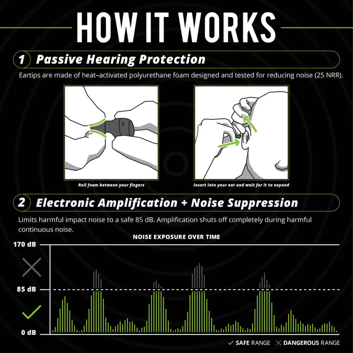 ·Aware Technology™ amplifies environmental sound for awareness, and limits harmful noise to 85 dB