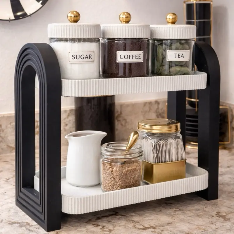 Add a modern, sophisticated touch to your kitchen with this beautiful two-tier organizer. Perfect for keeping your sugar, coffee, tea, and other daily essentials tidy, it combines functionality and style in a single product.
