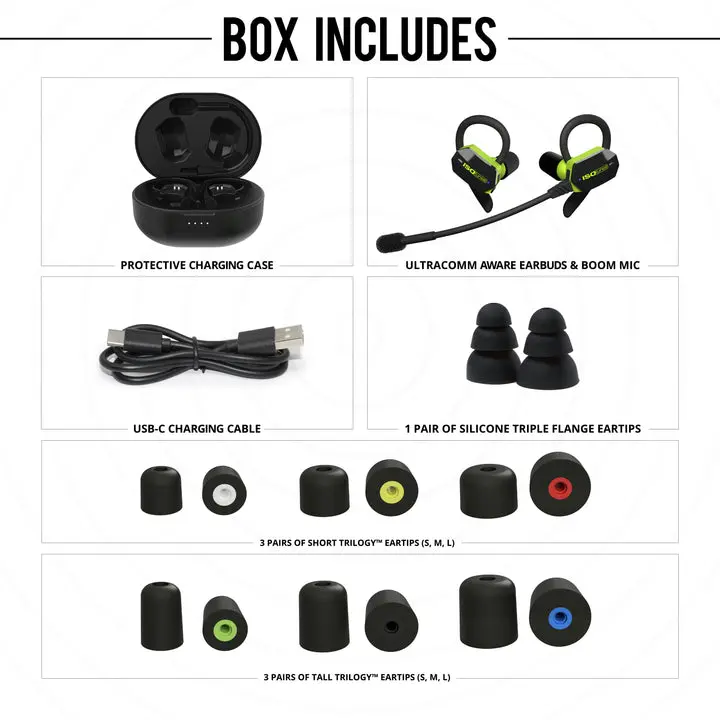 ·ULTRACOMM Aware comes with a variety pack of foam and silicone eartips, detachable boom mic, detachable earhooks, USB-C charging cable, and a charging case