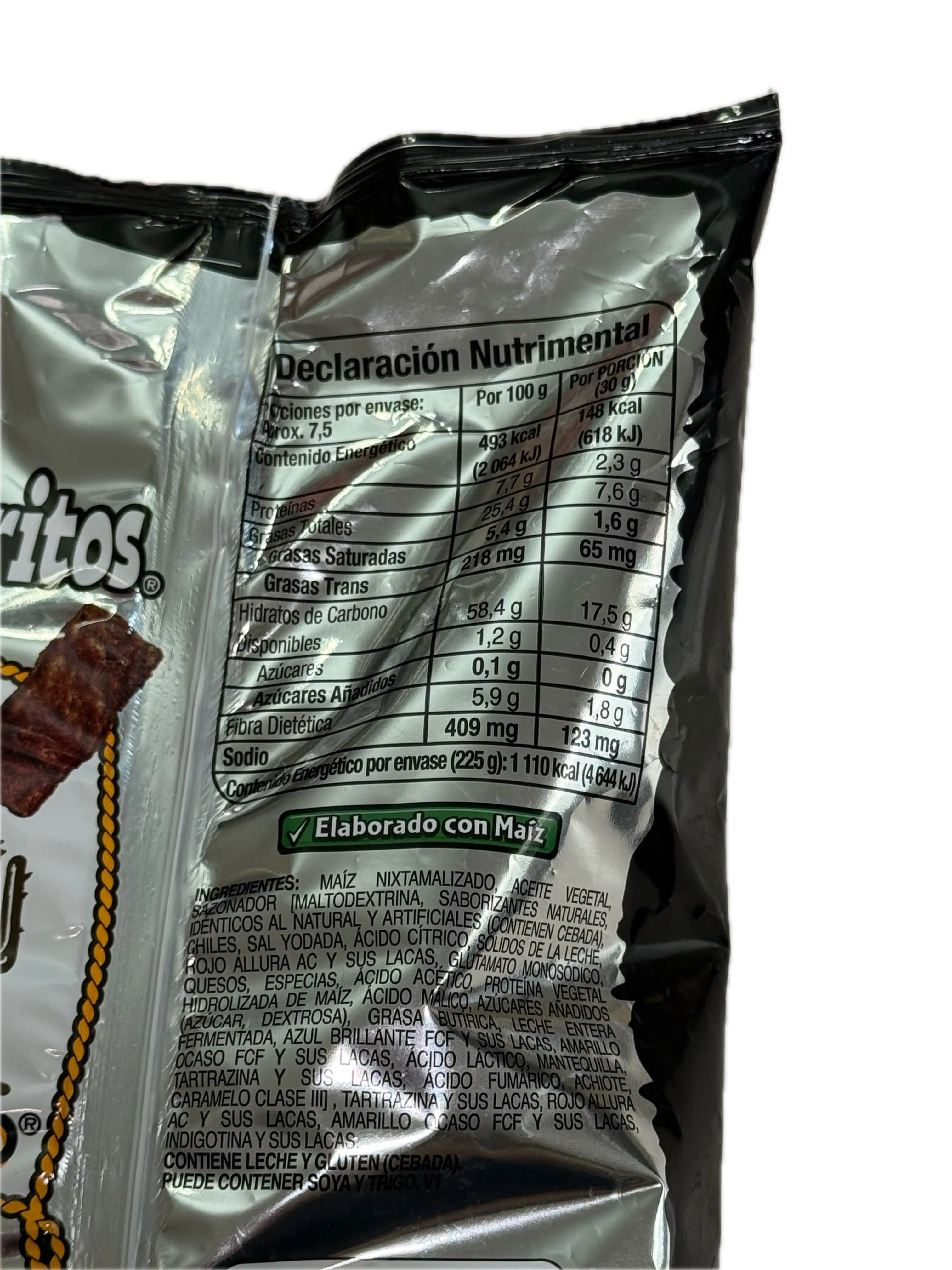 Made from nixtamalized corn, vegetable oil, and seasoning. Includes chili peppers, iodized salt, and cheese. Contains milk and barley (gluten). May contain soy and wheat. Seasoning includes maltodextrin, natural and artificial flavorings, and various additives. Enjoy the rich flavors responsibly.