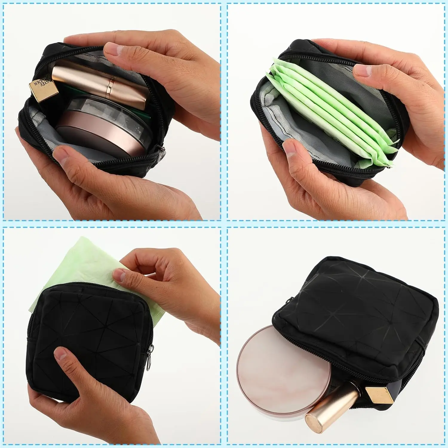 ·Multi-Use: Can also store tampons, nursing pads, keys, cosmetics, cash, cards, earphones, and small essentials.