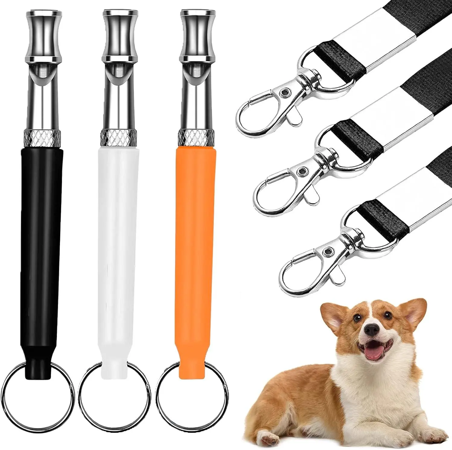 ·3-Pack Ultrasonic Dog Whistle: Comes with 3 whistles (black, white, orange) and 3 lanyards. Great for training your dog with different commands.