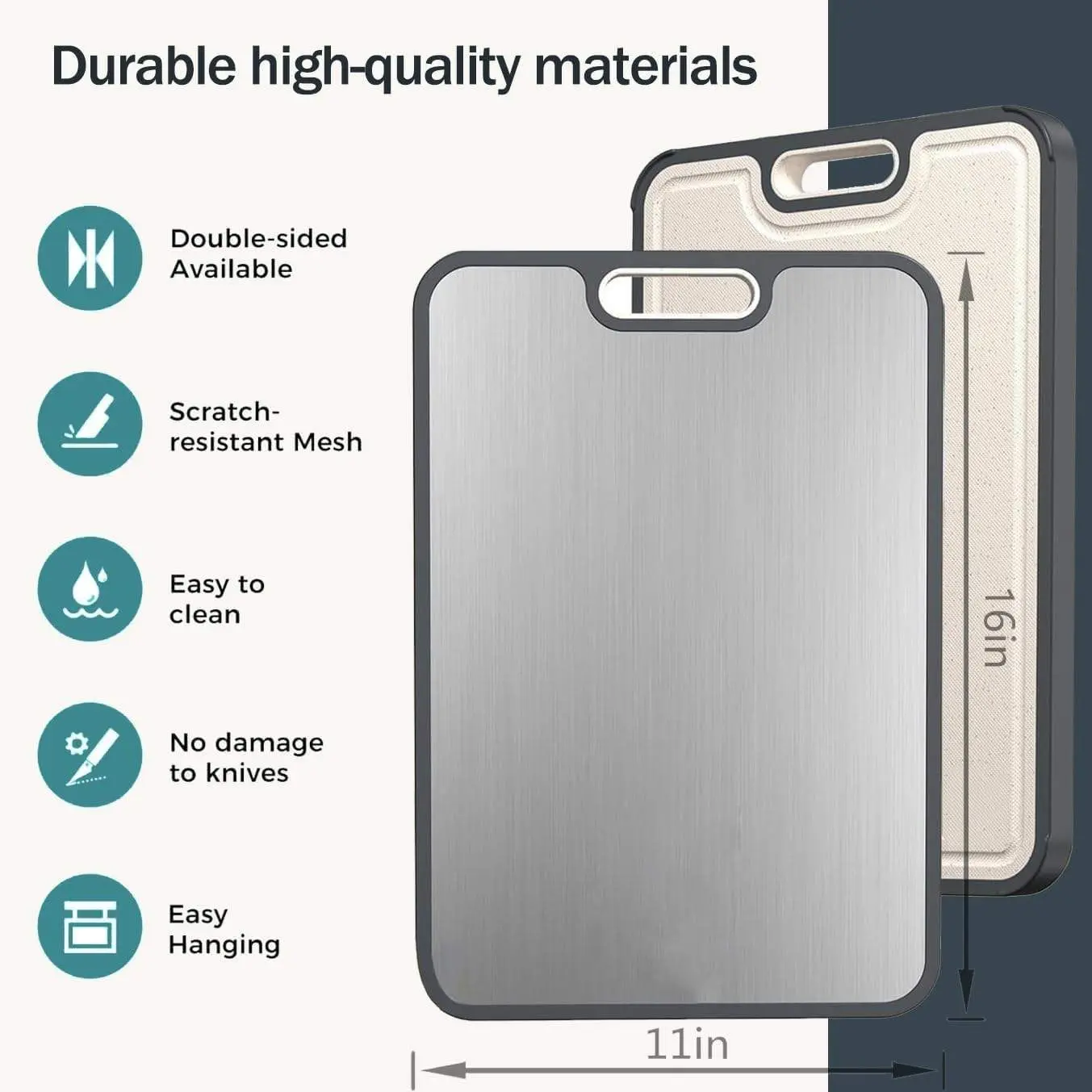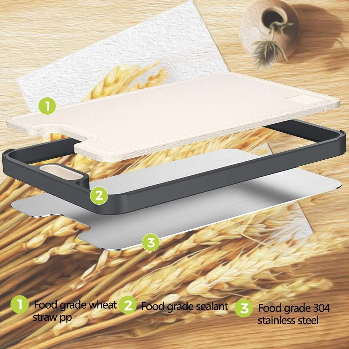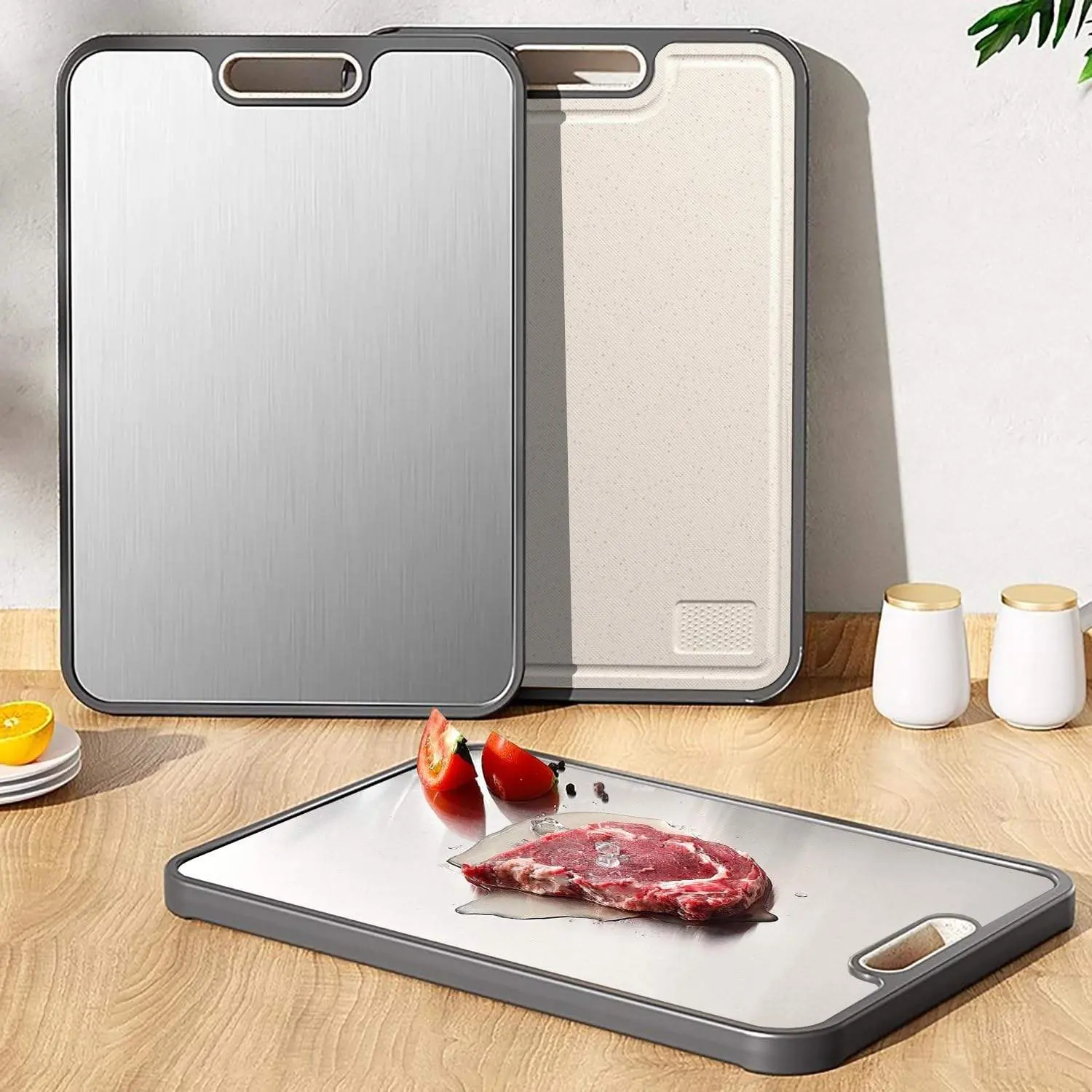 ·Durable Construction: The high quality cutting board stainless steel side resists scratches and stains, suitable for cutting meat; while the wheat straw PP side is knife-friendly for cutting fruit and vegetable